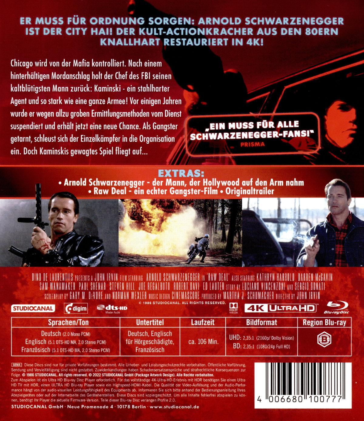 RAW DEAL ist ein amerikanischer Actionfilm aus dem Jahr 1986 unter der Regie von John Irvin, nach einer Geschichte von Sergio Leones Drehbuchautoren Luciano Vincenzoni und Sergio Donati. In den Hauptrollen zu sehen sind Arnold Schwarzenegger, Kathryn Harrold, Darren McGavin und Sam Wanamaker. Präsentiert wurde der Actionkracher von Hollywood-Produzenten-Legende Dino de Laurentiis, der Arnold Schwarzenegger in den Jahren zuvor mit der Besetzung in den CONAN Filmen zu seinem Durchbruch in Hollywood verholfen hatte.