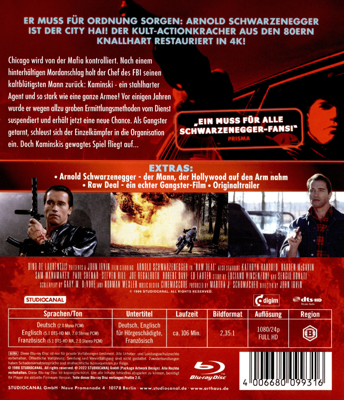 RAW DEAL ist ein amerikanischer Actionfilm aus dem Jahr 1986 unter der Regie von John Irvin, nach einer Geschichte von Sergio Leones Drehbuchautoren Luciano Vincenzoni und Sergio Donati. In den Hauptrollen zu sehen sind Arnold Schwarzenegger, Kathryn Harrold, Darren McGavin und Sam Wanamaker. Präsentiert wurde der Actionkracher von Hollywood-Produzenten-Legende Dino de Laurentiis, der Arnold Schwarzenegger in den Jahren zuvor mit der Besetzung in den CONAN Filmen zu seinem Durchbruch in Hollywood verholfen hatte.
