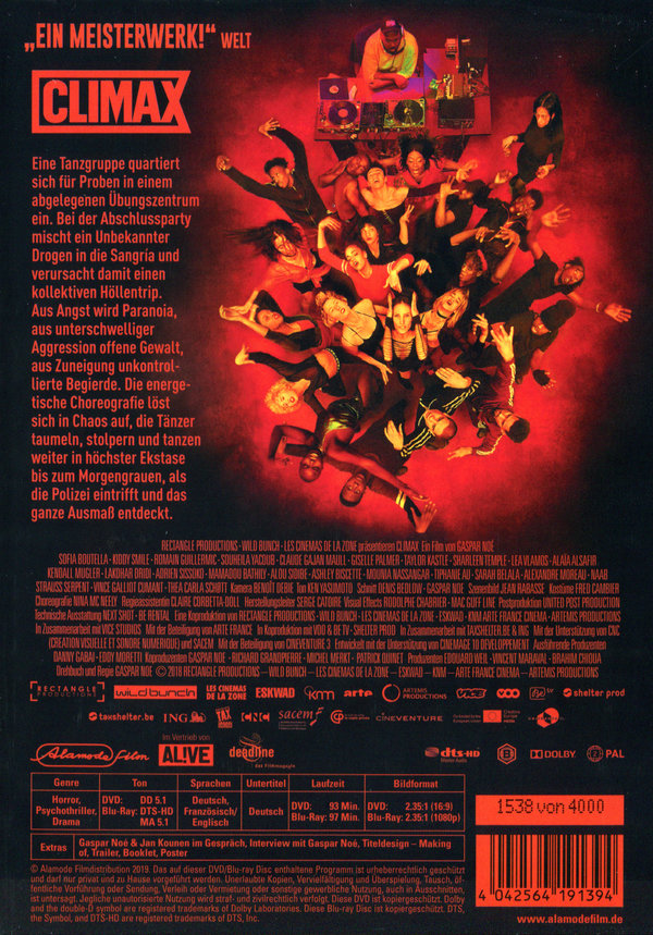 Eine Tanzgruppe quartiert sich für Proben in einem abgelegenen Übungszentrum ein. Bei der Abschlussparty mischt ein Unbekannter Drogen in die Sangría und verursacht damit einen kollektiven Höllentrip. Aus Angst wird Paranoia, aus unterschwelliger Aggression offene Gewalt, aus Zuneigung unkontrollierte Begierde. Die energetische Choreographie löst sich in Chaos auf, die Tänzer taumeln, stolpern und tanzen weiter in höchster Ekstase bis zum Morgengrauen als die Polizei eintrifft und das ganze Ausmaß entdeckt. Ein atemlos faszinierender Rausch von einem elektrisierenden Soundtrack getrieben bis zur Bewusstlosigkeit, gefilmt in kürzester Zeit mit professionellen Tänzern (u.a. mit der legendären Breakdancerin Sofia Boutella). Mit CLIMAX läuft Gaspar Noé zu neuer Höchstform auf und gewann damit die Quinzaine des Réalisateurs beim diesjährigen Festival in Cannes. „Eine bemerkenswert originelle, äußerst verstörende Arbeit, wie man sie zuvor noch nicht im Kino gesehen hat: Ein psychotroper Street-Dance-Film, der sich bald in einen orgastischen Höllentrip verwandelt.“ (Screen Daily) „Buchstäblich ein Höhepunkt Noés bisherigen Schaffens ... was für eine Erfahrung, was für ein Rausch, was für ein Höllenritt." (Kinozeit.de) „Ein irrer, experimenteller Film – zeitweise sehr witzig und dann wieder nervenzerfetzend intensiv.“ (Cinevue)