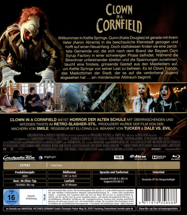 Willkommen in Kettle Springs.Quinn (Katie Douglas) ist gerade mit ihrem Vater (Aaron Abrams) in die beschauliche Kleinstadt gezogen und hofft auf einen Neuanfang. Doch stattdessen finden sie eine zerrüttete Gemeinde vor, die sich nach dem Brand der Baypen Corn Syrup Factory in einer schwierigen Phase befindet. Während die Bewohner untereinander streiten und die Spannungen zunehmen, taucht eine finstere, grinsende Gestalt aus den Maisfeldern auf, um Kettle Springs von seiner Last zu befreien. Es ist Clown Frendo, das Maskottchen der Stadt, der es auf die verdorbene Jugend abgesehen hat … ein mörderischer Albtraum beginnt."Clown in a Cornfield" bietet Horror der alten Schule mit überraschenden und witzigen Twists im Retro-Slasher-Stil.