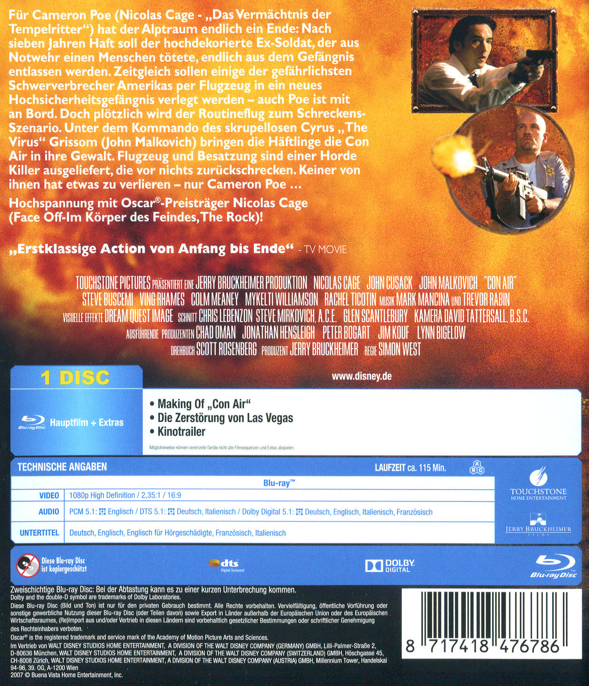 Für Cameron Poe (Nicolas Cage) hat der Alptraum endlich ein Ende: Nach sieben Jahren Haft soll der hochdekorierte Ex-Soldat, der aus Notwehr einen Menschen tötete, endlich aus dem Gefängnis entlassen werden. Zeitgleich sollen einige der gefährlichsten Schwerverbrecher Amerikas per Flugzeug in ein neues Hochsicherheitsgefängnis verlegt werden - auch Poe ist mit an Bord. Doch plötzlich wird der Routineflug zum Schreckens-Szenario. Unter dem Kommando des skrupellosen Cyrus "The Virus" Grissom (John Malkovich) bringen die Häftlinge die Con Air in ihre Gewalt. Flugzeug und Besatzung sind einer Horde Killer ausgeliefert, die vor nichts zurückschrecken. Keiner von ihnen hat etwas zu verlieren - nur Cameron Poe...