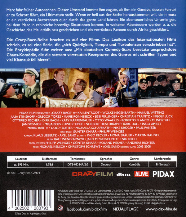 Die Crazy-Race-Reihe brachte es auf vier Filme. Das Lexikon des Internationalen Films schrieb, es sei eine Serie, die „sich Quirligkeit, Tempo und Turbulenzen verschrieben hat“. Die Enzyklopädie fuhr weiter aus: „Mit deutschen Comedy-Stars besetzte anspruchslose Chaos-Komödie, die die sattsam vertrauten Rezepturen des Genres mit schrillen Typen und viel Klamauk feil bietet“. Der erste Teil der Reihe brachte es auf 6,23 Millionen Zuseherinnen und Zuseher. In allen vier Filmen sind Katy Karrenbauer, Dirk Bach und Ottfried Fischer in Gastrollen zu sehen.