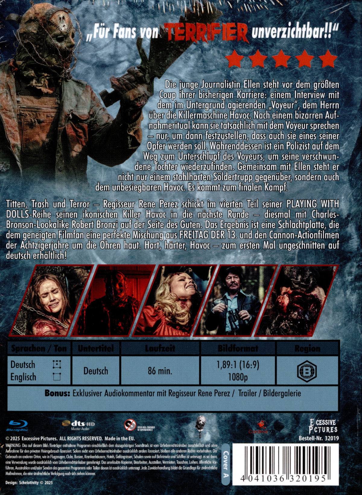 Die junge Journalistin Ellen steht vor dem größten Coup ihrer bisherigen Karriere: Einem Interview mit dem im Untergrund agierenden „Voyeur“, dem Herrn über die Killermaschine Havoc. Nach einem bizarren Aufnahmeritual kann sie tatsächlich mit dem Voyeur sprechen – nur, um dann festzustellen, dass auch sie eines seiner Opfer werden soll. Währenddessen ist ein Polizist auf dem Weg zum Unterschlupf des Voyeurs, um seine verschwundene Tochter wiederzufinden. Gemeinsam mit Ellen steht er nicht nur einem stahlharten Söldnertrupp gegenüber, sondern auch dem unbesiegbaren Havoc. Es kommt zum finalen Kampf! Titten, Trash und Terror – Regisseur René Perez schickt im vierten Teil seiner PLAYING WITH DOLLS-Reihe seinen ikonischen Killer Havoc in die nächste Runde – diesmal mit Charles-Bronson-Lookalike Robert Bronzi auf der Seite des Guten. Das Ergebnis ist eine Schlachtplatte, die dem geneigten Filmfan eine perfekte Mischung aus FREITAG DER 13. und den Cannon-Actionfilmen der Achtzigerjahre um die Ohren haut. Hart, härter, Havoc – zum ersten Mal ungeschnitten auf Deutsch erhältlich!