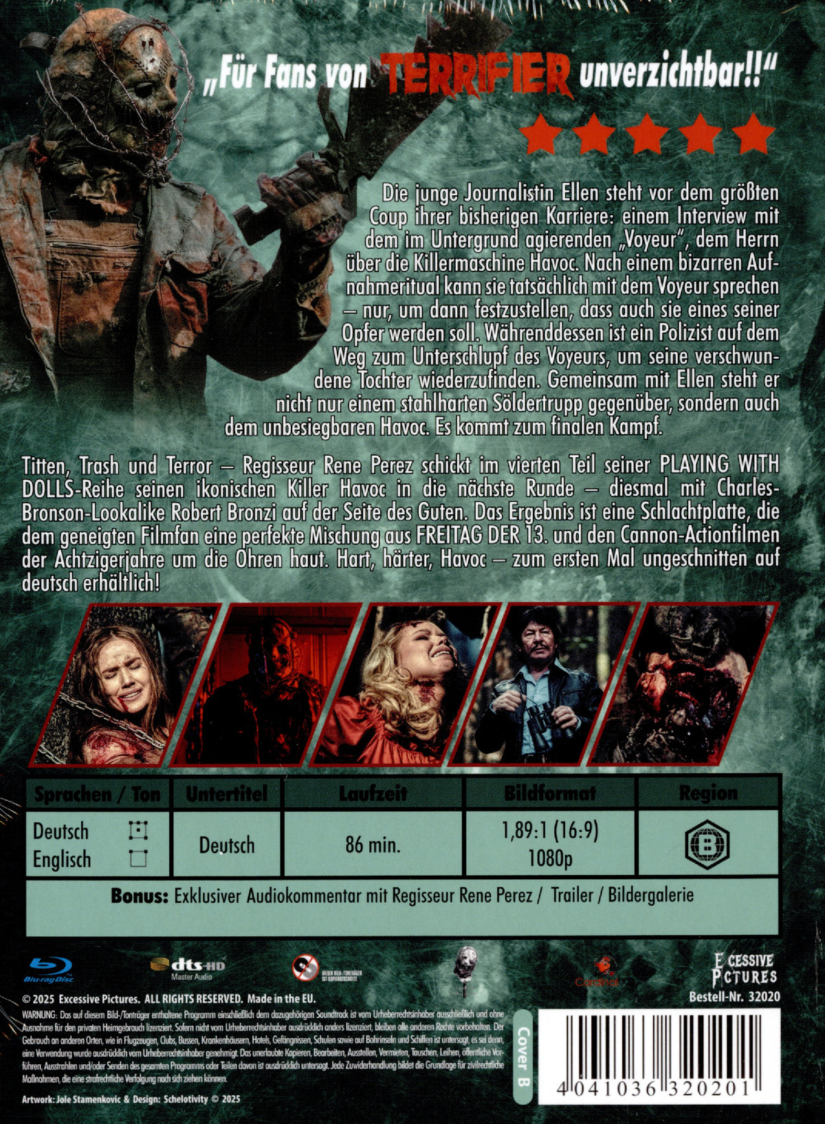 Die junge Journalistin Ellen steht vor dem größten Coup ihrer bisherigen Karriere: Einem Interview mit dem im Untergrund agierenden „Voyeur“, dem Herrn über die Killermaschine Havoc. Nach einem bizarren Aufnahmeritual kann sie tatsächlich mit dem Voyeur sprechen – nur, um dann festzustellen, dass auch sie eines seiner Opfer werden soll. Währenddessen ist ein Polizist auf dem Weg zum Unterschlupf des Voyeurs, um seine verschwundene Tochter wiederzufinden. Gemeinsam mit Ellen steht er nicht nur einem stahlharten Söldnertrupp gegenüber, sondern auch dem unbesiegbaren Havoc. Es kommt zum finalen Kampf! Titten, Trash und Terror – Regisseur René Perez schickt im vierten Teil seiner PLAYING WITH DOLLS-Reihe seinen ikonischen Killer Havoc in die nächste Runde – diesmal mit Charles-Bronson-Lookalike Robert Bronzi auf der Seite des Guten. Das Ergebnis ist eine Schlachtplatte, die dem geneigten Filmfan eine perfekte Mischung aus FREITAG DER 13. und den Cannon-Actionfilmen der Achtzigerjahre um die Ohren haut. Hart, härter, Havoc – zum ersten Mal ungeschnitten auf Deutsch erhältlich!