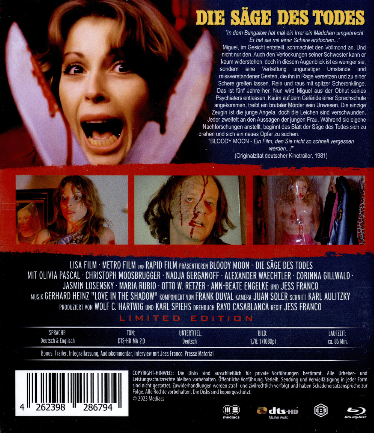 Miguel, im Gesicht entstellt, schmachtet den Vollmond an. Und nicht nur den. Auch den Verlockungen seiner Schwester kann er kaum widerstehen, doch in diesem Augenblick ist es weniger sie, sondern eine Verkettung ungünstiger Umstände und missverstandener Gesten, die ihn in Rage versetzen und zu einer Schere greifen lassen. Rein und raus mit spitzer Scherenklinge. Das ist fünf Jahre her. Nun wird Miguel aus der Obhut seines Psychiaters entlassen. Kaum auf dem Gelände einer Sprachschule angekommen, treibt ein brutaler Mörder sein Unwesen. Die einzige Zeugin ist die junge Angela, doch die Leichen sind verschwunden. Jeder zweifelt an den Aussagen der jungen Frau. Während sie eigene Nachforschungen anstellt, beginnt das Blatt der Säge des Todes sich zu drehen und sich ein neues Opfer zu suchen.