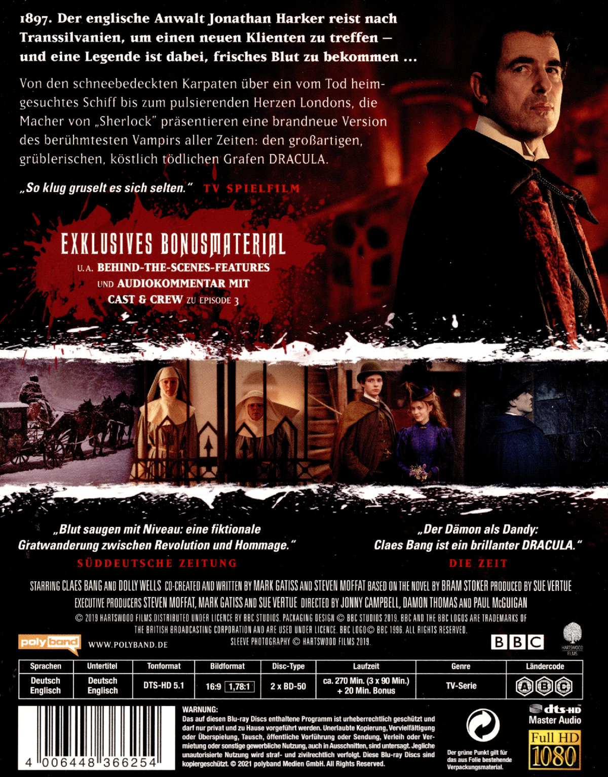 Von den schneebedeckten Karpaten über ein vom Tod heimgesuchtes Schiff bis zum pulsierenden Herzen Londons, Steven Moffat und Mark Gatiss, die Macher von „Sherlock“, präsentieren eine brandneue Version des berühmtesten Vampirs aller Zeiten: den großartigen, grüblerischen, köstlich tödlichen Grafen Dracula.