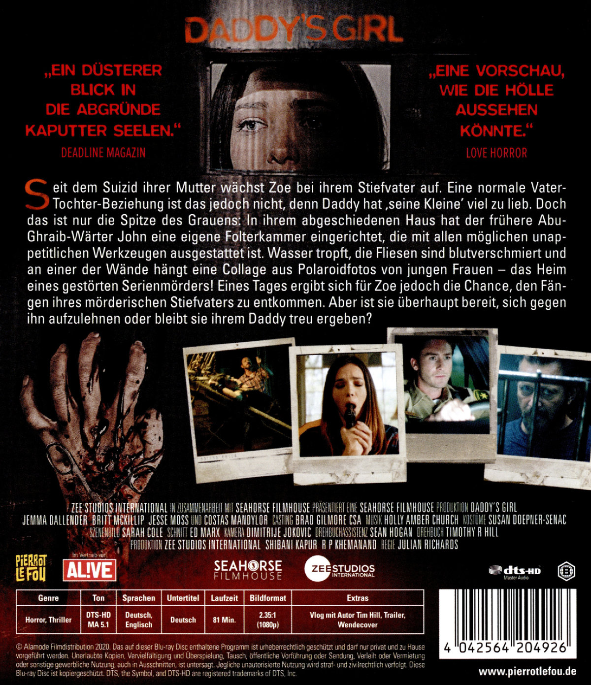 Seit dem Suizid ihrer Mutter wächst Zoe bei ihrem Stiefvater auf. Eine normale Vater-Tochter-Beziehung ist das jedoch nicht, denn Daddy hat 'seine Kleine' viel zu lieb. Doch das ist nur die Spitze des Grauens: In ihrem abgeschiedenen Haus hat der frühere Abu-Ghraib-Wärter John eine eigene Folterkammer eingerichtet, die mit allen möglichen unappetitlichen Werkzeugen ausgestattet ist. Wasser tropft, die Fliesen sind blutverschmiert und an einer der Wände hängt eine Collage aus Polaroidfotos von jungen Frauen - das Heim eines gestörten Serienmörders! Eines Tages ergibt sich für Zoe jedoch die Chance, den Fängen ihres mörderischen Stiefvaters zu entkommen. Aber ist sie überhaupt bereit, sich gegen ihn aufzulehnen oder bleibt sie ihrem Daddy treu ergeben? Daddy's Girl ist ein intensiver Abstieg in die persönliche Hölle eines gnadenlosen Killers, der sich ohne zu fragen alles zu eigen macht - auch seine Tochter. In den Hauptrollen glänzen der aus der populären 'Saw'-Reihe bekannte Costas Mandylor, Jemma Dallender ("I Spit On Your Grave 2") und Jesse Moss ("Final Destination 3").