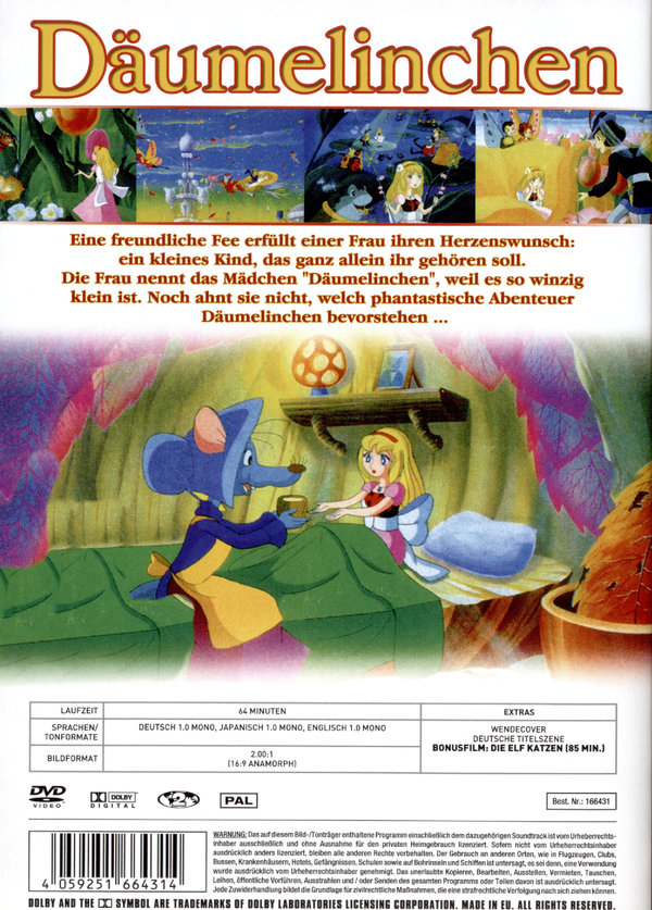 Extras: - Titelszene "Däumelinchen" Bonusfilm "Elf Hungrige Katzen" (Anime, Japan 1980), 85:18 Min. Elf hungrige Katzen stellen im Katzendorf alles auf den Kopf. Die anderen Katzendorf-Bewohner sind sehr verärgert...
