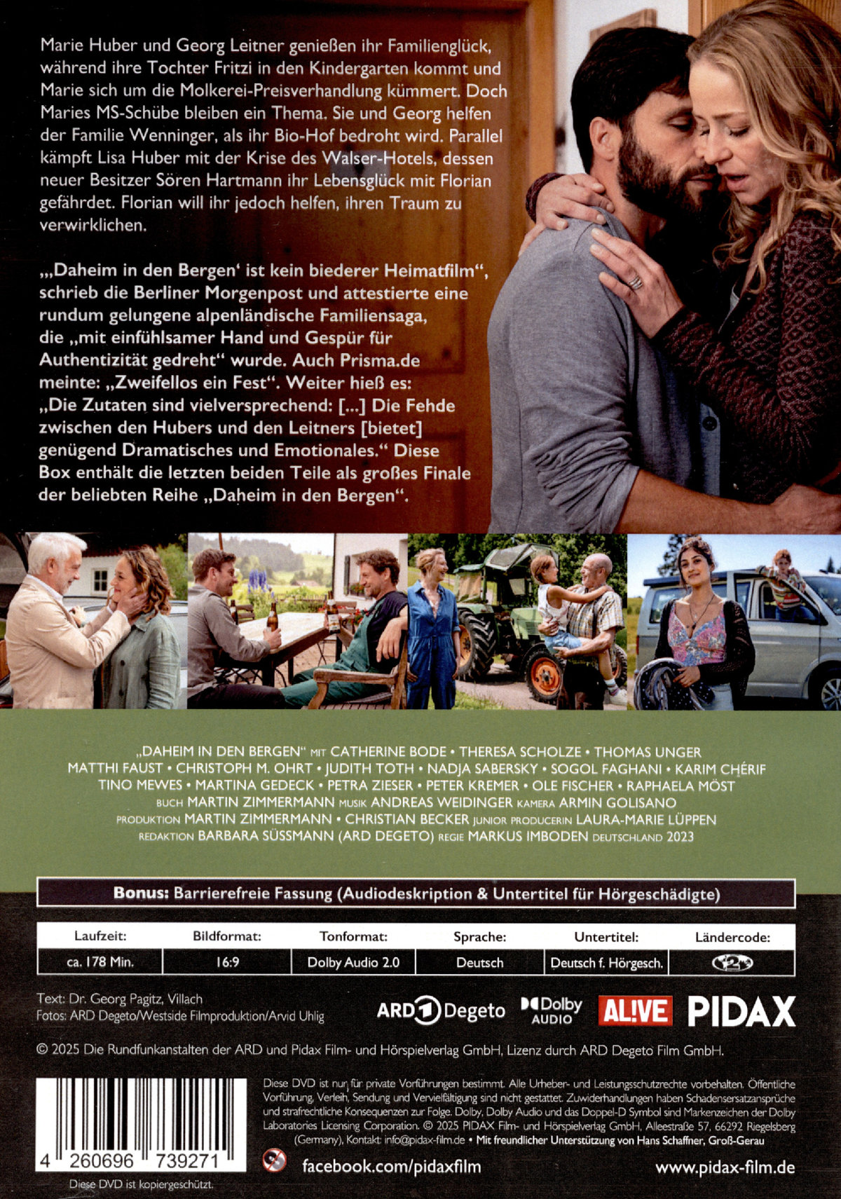 „‚Daheim in den Bergen‘ ist kein biederer Heimatfilm“, schrieb die Berliner Morgenpost und attestierte eine rundum gelungene alpenländische Familiensaga, die „mit einfühlsamer Hand und Gespür für Authentizität gedreht“ wurde. Auch Prisma.de meinte: „Zweifellos ein Fest“. Weiter hieß es: „Die Zutaten sind vielversprechend: [...] Die Fehde zwischen den Hubers und den Leitners [bietet] genügend Dramatisches und Emotionales.“ Diese Box enthält die letzten beiden Episoden!