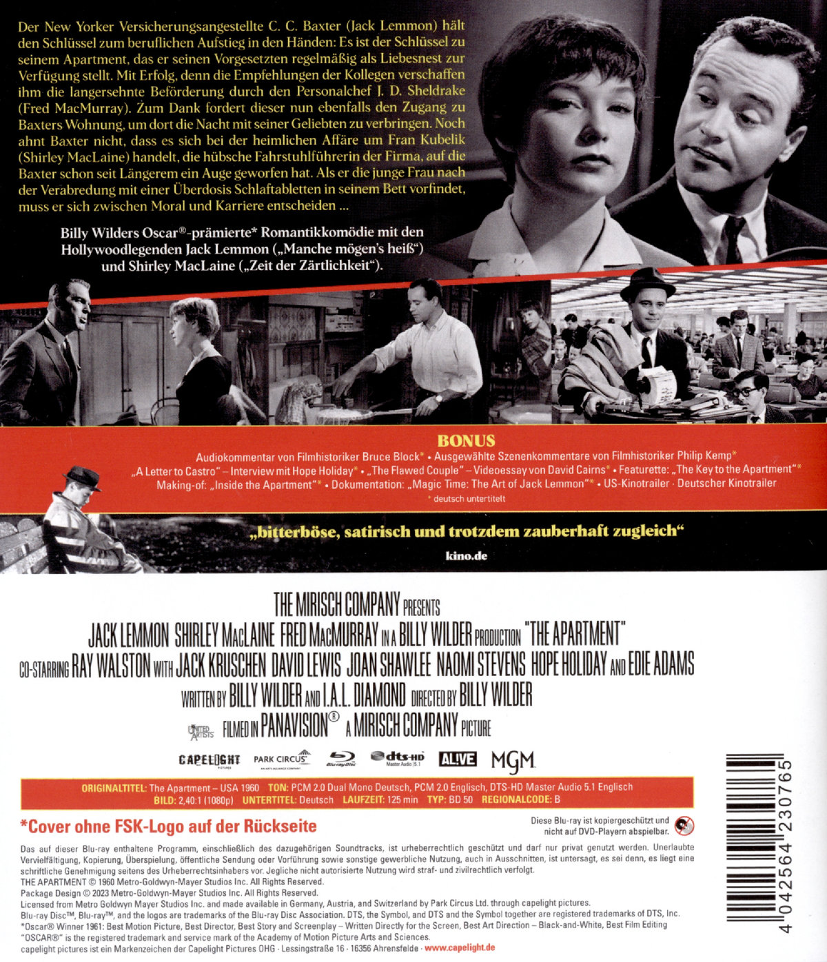 Bonus (deutsch untertitelt): Audiokommentar von Filmhistoriker Bruce Block; Ausgewählte Szenenkommentare von Filmhistoriker Philip Kemp; "A Letter to Castro" – Interview mit Hope Holiday; "The Flawed Couple" – Videoessay von David Cairns; Featurette: "The Key to the Apartment"; Making-of: "Inside the Apartment"; Dokumentation: "Magic Time: The Art of Jack Lemmon"; US-Kinotrailer; Deutscher Kinotrailer; 24-seitiges Booklet