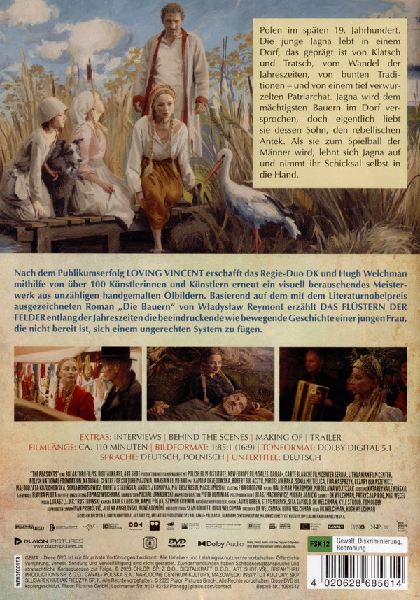 Polen im späten 19. Jahrhundert. Die junge Jagna lebt in einem Dorf, das geprägt ist von Klatsch und Tratsch, vom Wandel der Jahreszeiten, von bunten Traditionen – und von einem tief verwurzelten Patriarchat. Jagna wird dem mächtigsten Bauern im Dorf versprochen, doch eigentlich liebt sie dessen Sohn, den rebellischen Antek. Als sie zum Spielball der Männer wird, lehnt sich Jagna auf und nimmt ihr Schicksal selbst in die Hand. Nach dem Publikumserfolg LOVING VINCENT erschafft das Regie-Duo DK und Hugh Welchman mithilfe von über 100 Künstlerinnen und Künstlern erneut ein visuell berauschendes Meisterwerk aus unzähligen handgemalten Ölbildern. Basierend auf dem mit dem Literaturnobelpreis ausgezeichneten Roman „Die Bauern“ von W?adys?aw Reymont erzählt DAS FLÜSTERN DER FELDER entlang der Jahreszeiten die beeindruckende wie bewegende Geschichte einer jungen Frau, die nicht bereit ist, sich einem ungerechten System zu fügen.
