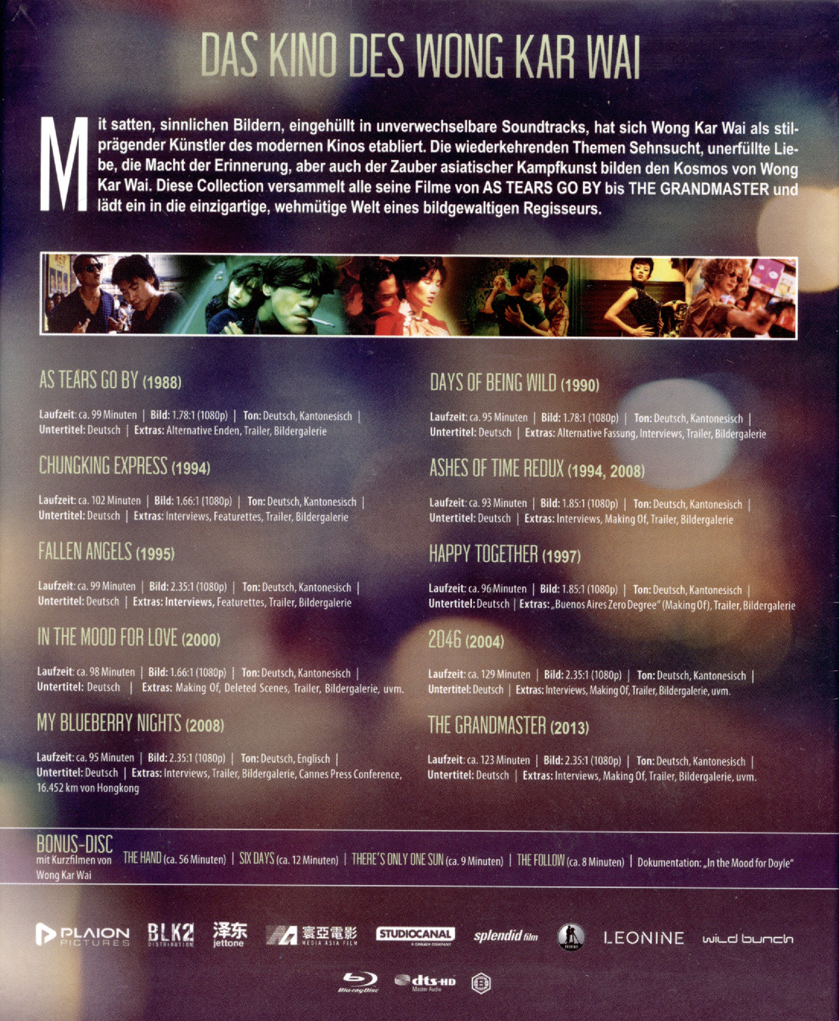 Mit satten, sinnlichen Bildern, eingehüllt in unverwechselbare Soundtracks, hat sich Wong Kar Wai als stilprägender Künstler des modernen Kinos etabliert. Die wiederkehrenden Themen Sehnsucht, unerfüllte Liebe, die Macht der Erinnerung, aber auch der Zauber asiatischer Kampfkunst bilden den Kosmos von Wong Kar Wai. Diese Collection versammelt alle seine Filme von AS TEARS GO BY bis THE GRANDMASTER und lädt ein in die einzigartige, wehmütige Welt eines bildgewaltigen Regisseurs. (11 Blu-rays)