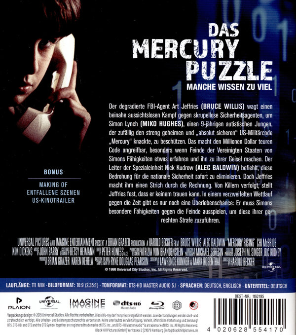Der degradierte FBI-Agent Art Jeffries (Bruce Willis) wagt einen beinahe aussichtslosen Kampf gegen skrupellose Sicherheitsagenten, um Simon Lynch (Miko Hughes), einen 9-jährigen autistischen Jungen, der zufällig den streng geheimen und „absolut sicheren“ US-Militärcode „Mercury“ knackte, zu beschützen. Das macht den Millionen Dollar teuren Code angreifbar, besonders wenn Feinde der Vereinigten Staaten von Simons Fähigkeiten etwas erfahren und ihn zu ihrer Geisel machen. Der Leiter der Spezialeinheit, Nick Kudrow (Alec Baldwin) befiehlt diese Bedrohung für die nationale Sicherheit sofort zu eliminieren. Doch Jeffries macht ihm einen Strich durch die Rechnung. Von Killern verfolgt, stellt Jeffries fest, dass er keinem trauen kann. In einem verzweifelten Wettlauf gegen die Zeit gibt es nur noch eine Überlebenschance: Er muss Simons besondere Fähigkeiten gegen die Feinde ausspielen, um diese ihrer gerechten Strafe zuzuführen.
