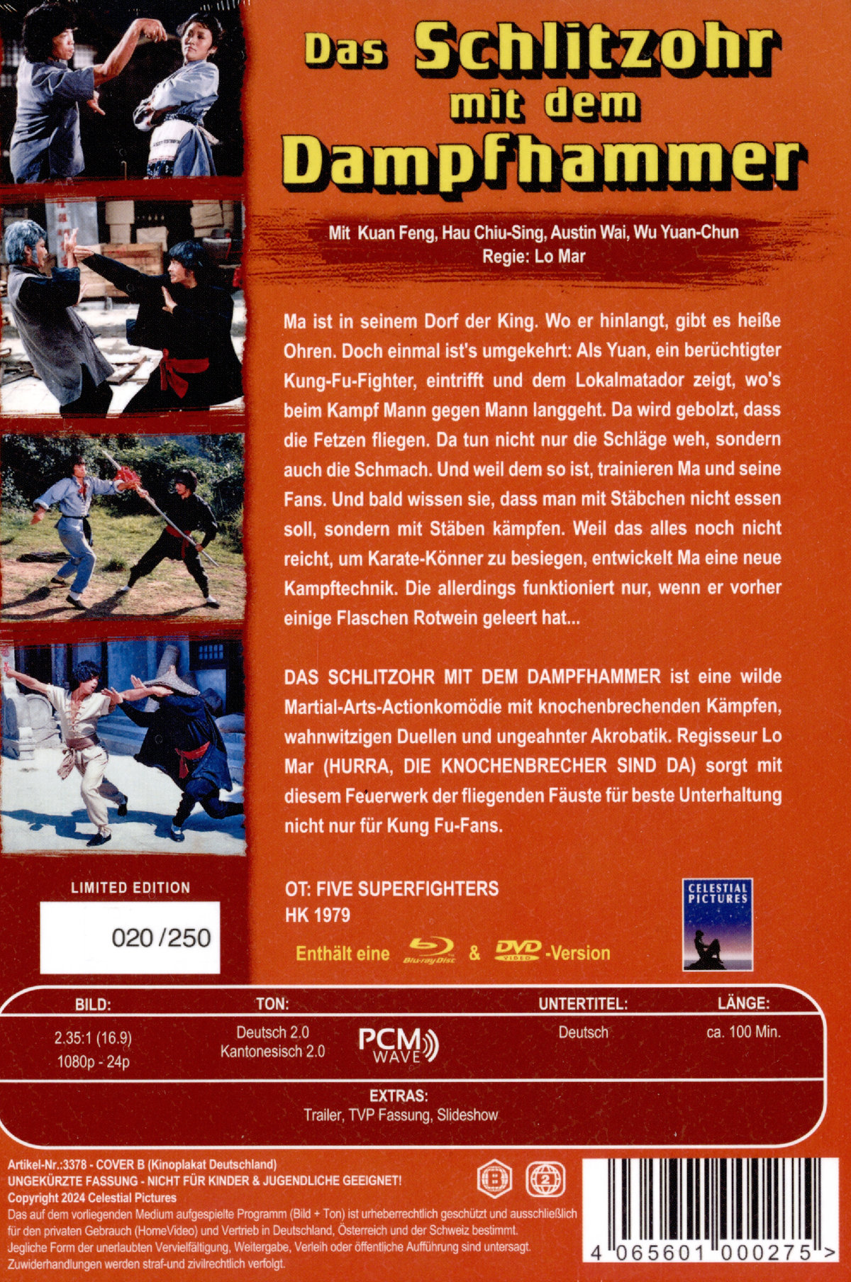 DAS SCHLITZOHR MIT DEM DAMPFHAMMER ist eine wilde Martial-Arts-Actionkomödie mit knochenbrechenden Kämpfen, wahnwitzigen Duellen und ungeahnter Akrobatik. Regisseur Lo Mar (Hurra, die Knochenbrecher sind da) sorgt mit diesem Feuerwerk der fliegenden Fäuste für beste Unterhaltung nicht nur für Kung Fu-Fans.
