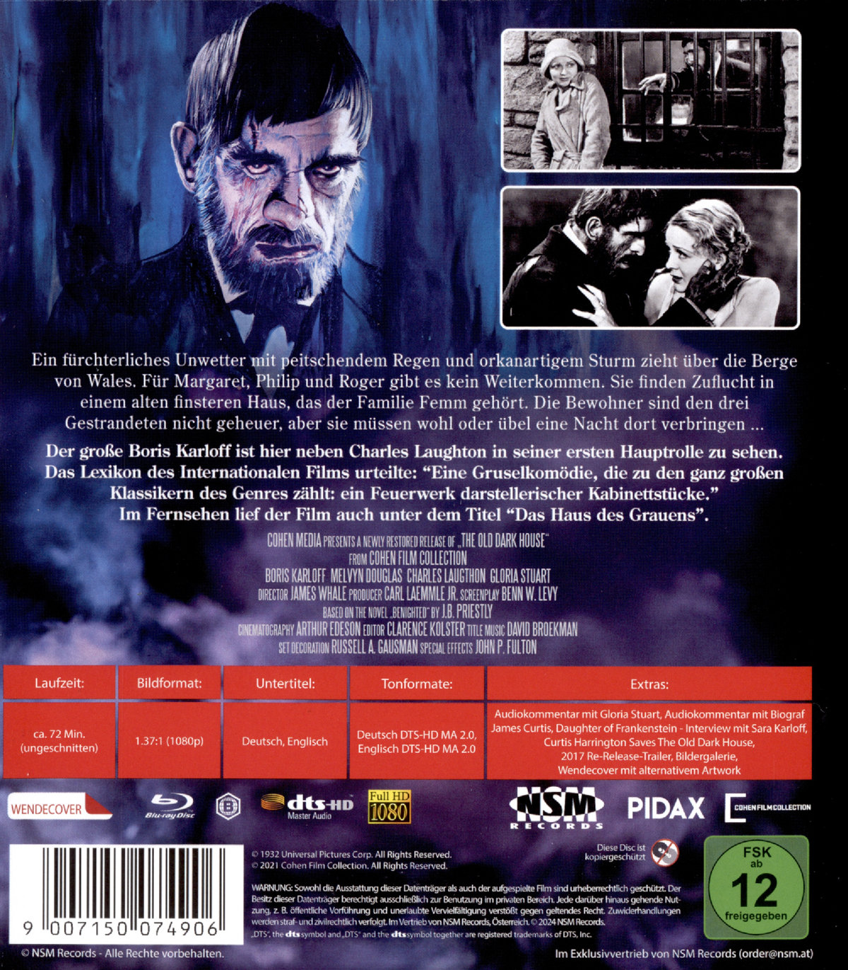 Audiokommentar von Schauspielerin Gloria Stuart (Englisch); Audiokommentar von James-Whale-Biograph James Curtis (Englisch); Featurette: Daughter of Frankenstein: A Conversation With Sara Karloff (HD) (Englisch mit optionalen Untertiteln deutsch oder englisch); Featurette: Curtis Harrington Saves The Old Dark House (SD) B43(Englisch mit optionalen Untertiteln deutsch oder englisch); 2017 Re-Release-Trailer (HD); Wendecover