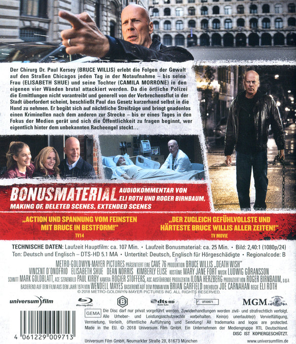 Der Chirurg Dr. Paul Kersey (Bruce Willis) erlebt die Folgen der Gewalt auf den Straßen Chicagos jeden Tag in der Notaufnahme – bis seine Frau (Elisabeth Shue) und seine Tochter (Camila Morrone) in den eigenen vier Wänden brutal attackiert werden.