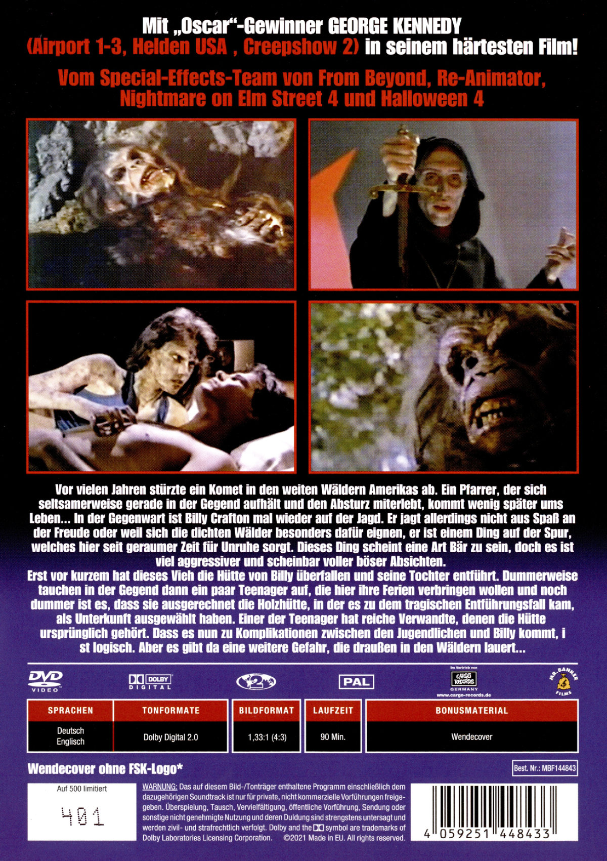 Erst vor kurzem hat dieses Vieh die Hütte von Billy überfallen und seine Tochter entführt. Dummerweise tauchen in der Gegend dann ein paar Teenager auf, die hier ihre Ferien verbringen wollen und noch dummer ist es, dass sie ausgerechnet die Holzhütte, in der es zu dem tragischen Entführungsfall kam, als Unterkunft ausgewählt haben. Einer der Teenager hat reiche Verwandte, denen die Hütte ursprünglich gehört. Dass es nun zu Komplikationen zwischen den Jugendlichen und Billy kommt, ist logisch. Aber es gibt da eine weitere Gefahr, die draußen in den Wäldern lauert ...