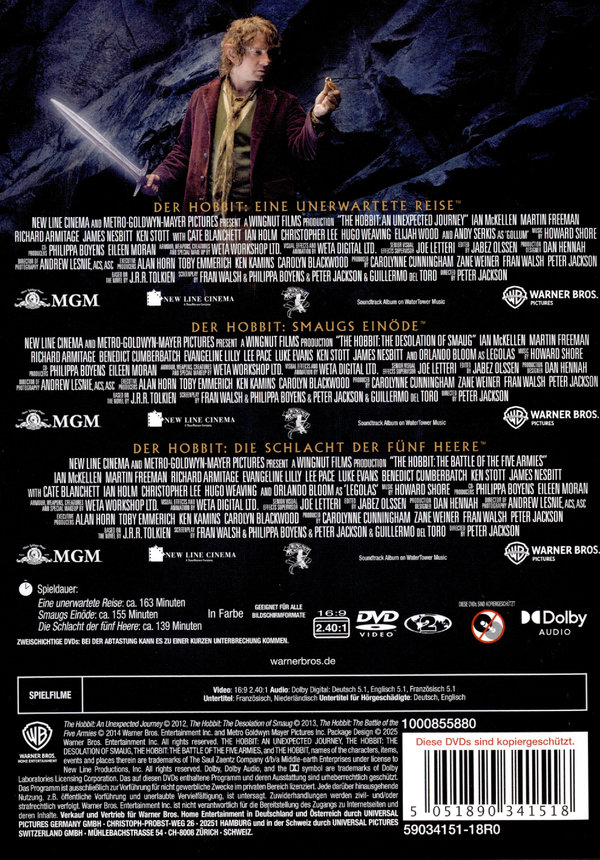 Erleben Sie Regisseur Peter Jacksons komplettes episches AbenteuerAlle drei Filme der "Hobbit"-Trilogie. Peter Jackson reist zurück nach Middle Earth mit einem neuen Abenteuer von Bilbo Baggins, der in das legendäre Abenteuer verwickelt wird, das verlorene Zwergenreich Erebor von dem schrecklichen Drachen Smaug zurückzuerobern. Bilbo und seine Begleiter, dreizehn Zwerge und Gandalf, treffen auf Trolle, Orks, Kobolde, Elfen und den geheimnisvollen Gollum.Enthält alle drei Filme als Kinofassung:- "Der Hobbit: Eine unerwartete Reise"- "Der Hobbit: Smaugs Einöde"- "Der Hobbit: Die Schlacht der fünf Heere"