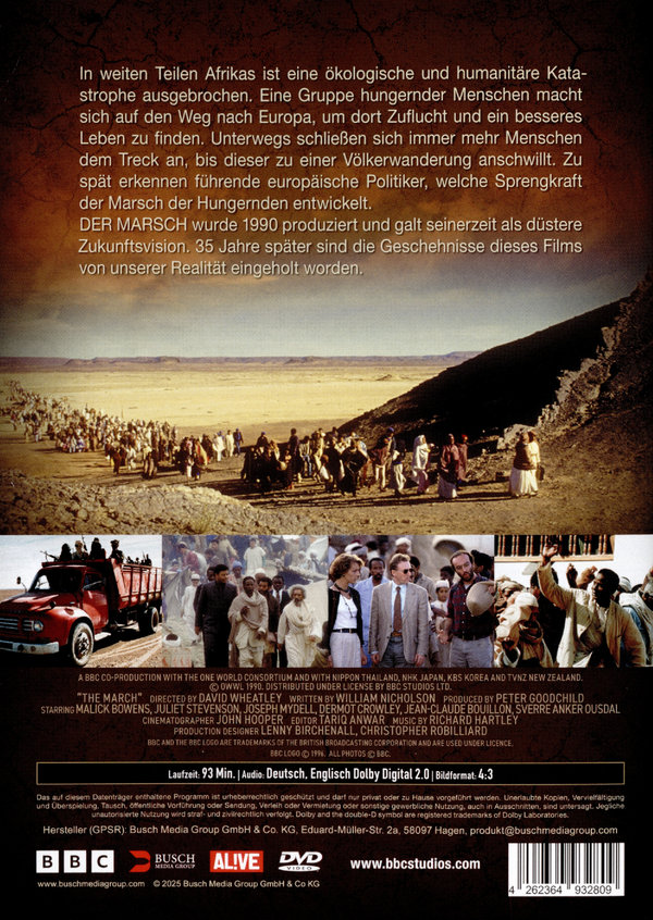 In weiten Teilen Afrikas ist eine ökologische und humanitäre Katastrophe ausgebrochen. Eine Gruppe hungernder Menschen macht sich auf den Weg nach Europa, um dort Zuflucht und ein besseres Leben zu finden. Unterwegs schließen sich immer mehr Menschen dem Treck an, bis dieser auf unübersehbare Größe anschwillt. Zu spät erkennen führende europäische Politiker, welche Sprengkraft der Marsch der Hungernden entwickelt. DER MARSCH wurde 1990 produziert und galt seinerzeit als düstere Zukunftsvision. 35 Jahre später scheinen die Geschehnisse dieses Films von unserer Realität eingeholt worden zu sein.
