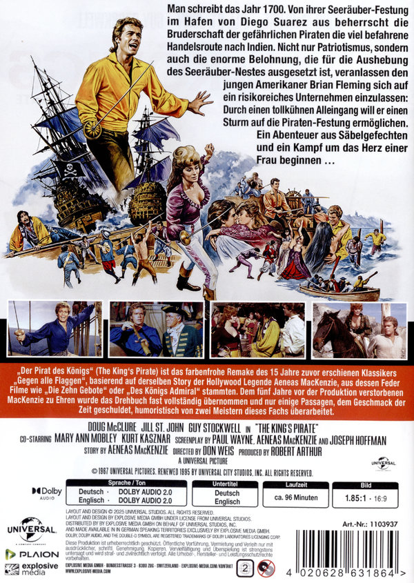 "Der Pirat des Königs" zeigt perfekten Nervenkitzel, Action, Abenteuer, Verwegenheit und das schillernde Spektakel des Schwertkampfs. Obwohl die Geschichte schon früher erzählt wurde hilft hier eine straffe Handlung und nette Interpretation der Darsteller. Es ist ein tolles Remake des Films "Gegen alle Flaggen" (1952) von George Sherman mit Errol Flynn, Maureen O’Hara und Anthony Quinn mit Schnittmaterial aus dem Originalfilm. Der Star Doug McClure aus der Western-Serie "Die Leute von der Shiloh Ranch" als sympathischer Abenteurer geht bereitwillig auf Probleme ein, wie sie einst Tony Curtis vorbehalten waren. Er spielt einen ziemlich gutaussehenden britischen Offizier, der sich in eine Piratenbande einschleicht, um diese zu infiltrieren und klug und schnell arbeiten muss, um ihnen das Handwerk zu legen. Ihm zur Seite steht das hinreißende Bond-Girl und die ehemalige Miss America Jill St. John als verliebte Jessica Stephens. Als Nebendarsteller sind unter anderem Kurt Kasznar, Richard Deacon, Torin Thacher, Woodrow Parfrey und Sean McGlory zu sehen.