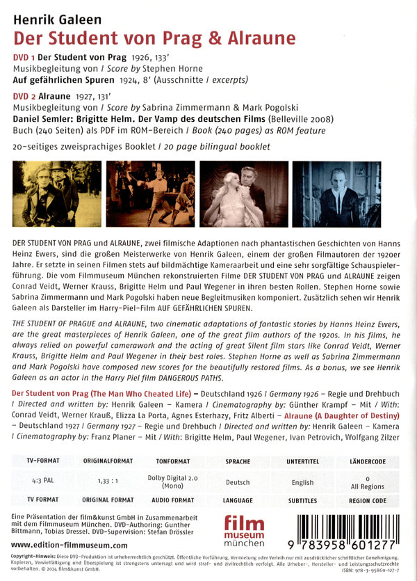 DER STUDENT VON PRAG und ALRAUNE, zwei filmische Adaptionen nach phantastischen Geschichten von Hanns Heinz Ewers, sind die großen Meisterwerke von Henrik Galeen, einem der großen Filmautoren der 1920er Jahre. Er setzte in seinen Filmen stets auf bildmächtige Kameraarbeit und eine sehr sorgfältige Schauspielerführung. Die vom Filmmuseum München rekonstruierten Filme DER STUDENT VON PRAG und ALRAUNE zeigen Conrad Veidt, Werner Krauss, Brigitte Helm und Paul Wegener in ihren besten Rollen. Stephen Horne sowie Sabrina Zimmermann und Mark Pogolski haben neue Begleitmusiken komponiert. Zusätzlich sehen wir Henrik Galeen als Darsteller im Harry-Piel-Film AUF GEFÄHRLICHEN SPUREN.