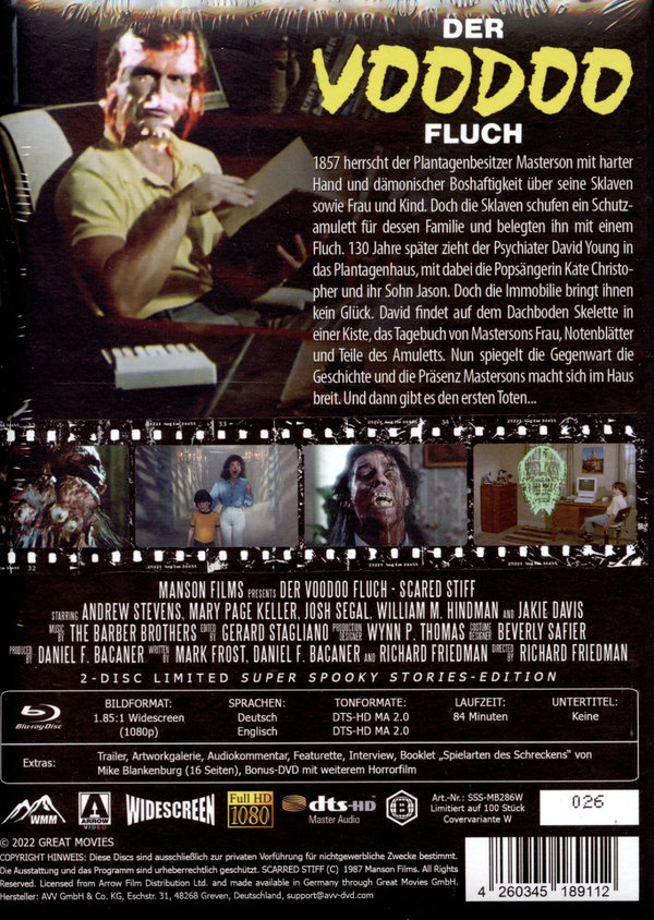 Extras: Trailer, Artworkgalerie, Audiokommentar, Featurette, Interview, Booklet „Spielarten des Schreckens“ von Mike Blankenburg (16 Seiten), Bonus-DVD mit weiterem Horrorfilm