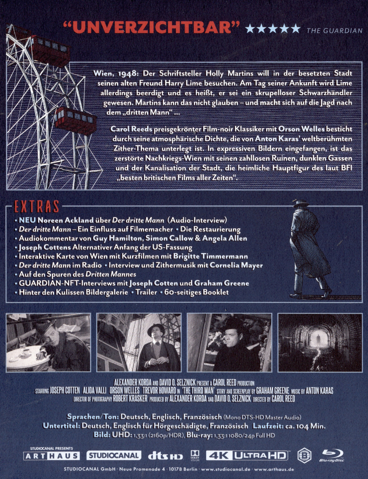 In Carol Reeds preisgekröntem Film-noir-Klassiker nach einer Erzählung von Graham Greene ist das zerstörte Wien die wahre Hauptfigur. Expressiv filmte Kameramann Robert Krasker die zahllosen Ruinen, dunklen Gassen und im packenden Finale sogar die Kanalisation der Stadt. Die atmosphärische Dichte wird durch Anton Karas‘ weltberühmtes Zither-Thema und Orson Welles‘ brillante Darstellung perfektioniert.