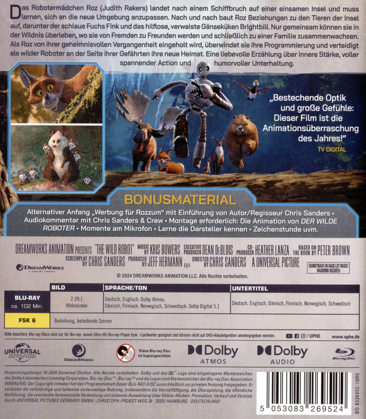 Rozzum 7134 - kurz "Roz" (Judith Rakers) - ist kein gewöhnlicher Roboter. Sie wurde eigentlich als Unterstützung für eine futuristische urbane Welt entwickelt, doch nun hat sie Schiffbruch erlitten und ist auf einer einsamen Insel gestrandet. Mit Mühe baut sie Beziehungen zu den zunächst argwöhnischen Tieren auf und lernt, sich an die ungewohnte, raue Umgebung anzupassen. Das große Abenteuer beginnt, als sie durch einen Zufall zur Beschützerin eines hilflosen, verwaisten Gänsekükens wird und die wahre Bedeutung des Lebens entdeckt.Nur gemeinsam können die beiden in der Wildnis überleben, wo sie von Fremden zu Freunden werden und schließlich zu einer Familie zusammenwachsen. Als Roz von ihrer geheimnisvollen Vergangenheit eingeholt wird, überwindet sie ihre Programmierung und verteidigt als DER WILDE ROBOTER an der Seite ihrer Gefährten ihre neue Heimat.