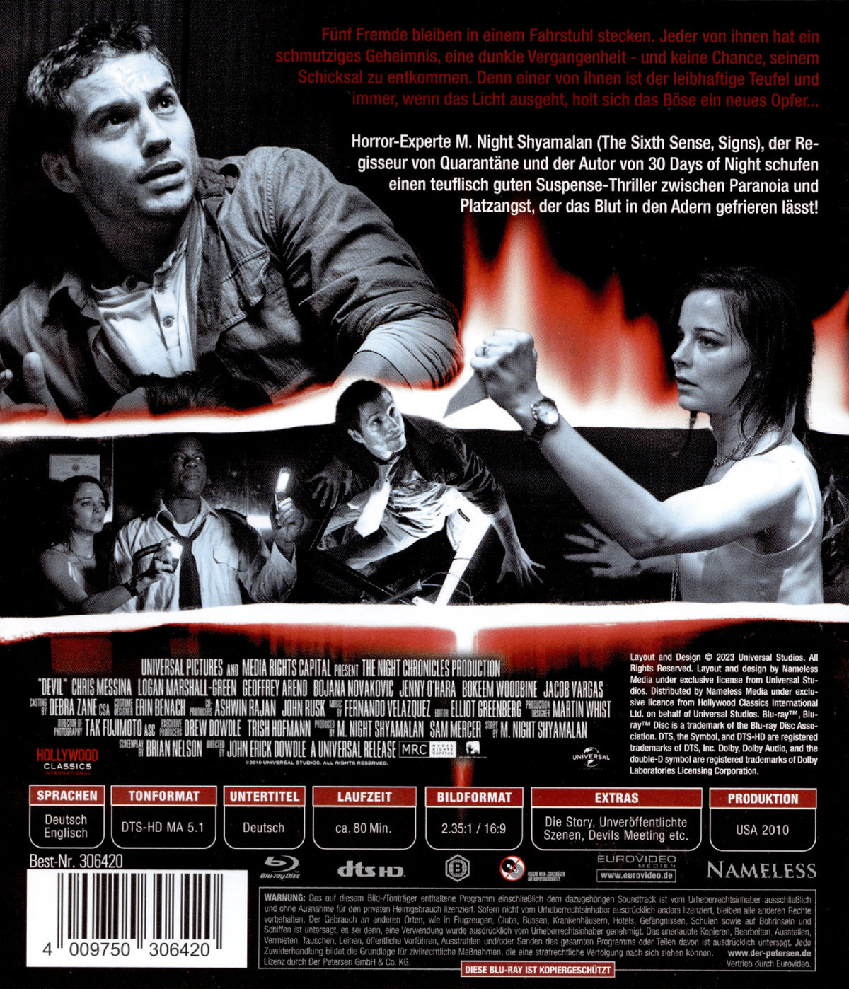 Fünf Fremde bleiben in einem Fahrstuhl stecken. Jeder von ihnen hat ein schmutziges Geheimnis, eine dunkle Vergangenheit - und keine Chance, seinem Schicksal zu entkommen. Denn einer von ihnen ist der leibhaftige Teufel und immer, wenn das Licht ausgeht, holt sich das Böse ein neues Opfer... Horror-Experte M. Night Shyamalan (The Sixth Sense, Signs), der Regisseur von Quarantäne und der Autor von 30 Days of Night schufen einen teuflisch guten Suspense-Thriller zwischen Paranoia und Platzangst, der das Blut in den Adern gefrieren lässt!
