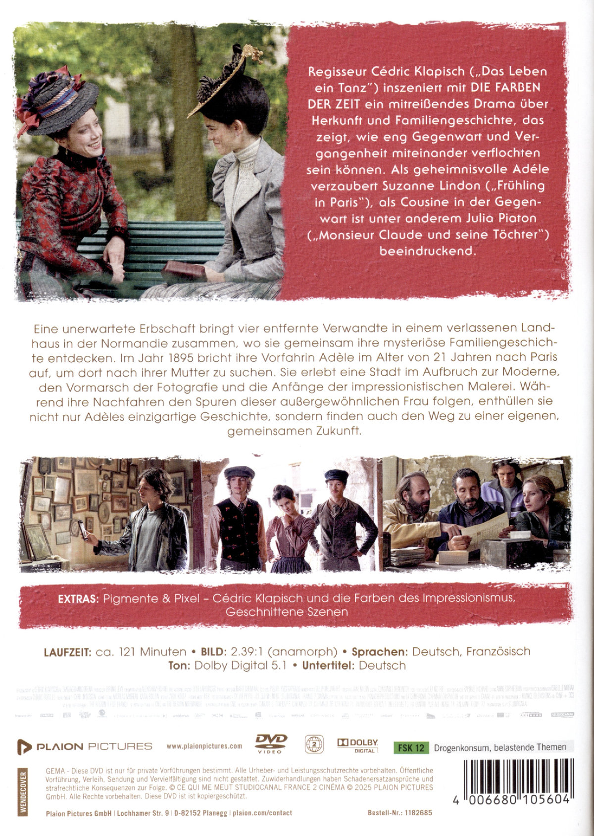Eine unerwartete Erbschaft bringt vier entfernte Verwandte in einem verlassenen Landhaus in der Normandie zusammen, wo sie gemeinsam ihre mysteriöse Familiengeschichte entdecken. Im Jahr 1895 bricht ihre Vorfahrin Adèle im Alter von 21 Jahren nach Paris auf, um dort nach ihrer Mutter zu suchen. Sie erlebt eine Stadt im Aufbruch zur Moderne, den Vormarsch der Fotografie und die Anfänge der impressionistischen Malerei. Während ihre Nachfahren den Spuren dieser außergewöhnlichen Frau folgen, enthüllen sie nicht nur Adèles einzigartige Geschichte, sondern finden auch den Weg zu einer eigenen, gemeinsamen Zukunft. Regisseur Cédric Klapisch („Das Leben ein Tanz”, „Der Wein und der Wind”) inszeniert mit DIE FARBEN DER ZEIT ein mitreißendes Drama über Herkunft und Familiengeschichte, das zeigt, wie eng Gegenwart und Vergangenheit miteinander verflochten sein können. Auf der Zeitebene des späten 19. Jahrhunderts brilliert Suzanne Lindon als mutige Adéle, an ihrer Seite spielen Paul Kircher als Maler Anatole, Vassili Schneider als Fotograf Lucien und Sara Giraudeau als Adéles Mutter Odette. In der Gegenwart verkörpern Abraham Wapler, Julia Piaton, Vincent Macaigne und Zinedine Soualem die vier Cousins Seb, Céline, Guy und Abdelkrim – zusammen mit Cécile de France, die als Kunsthistorikerin und Impressionismus-Expertin Calixte beeindruckt.