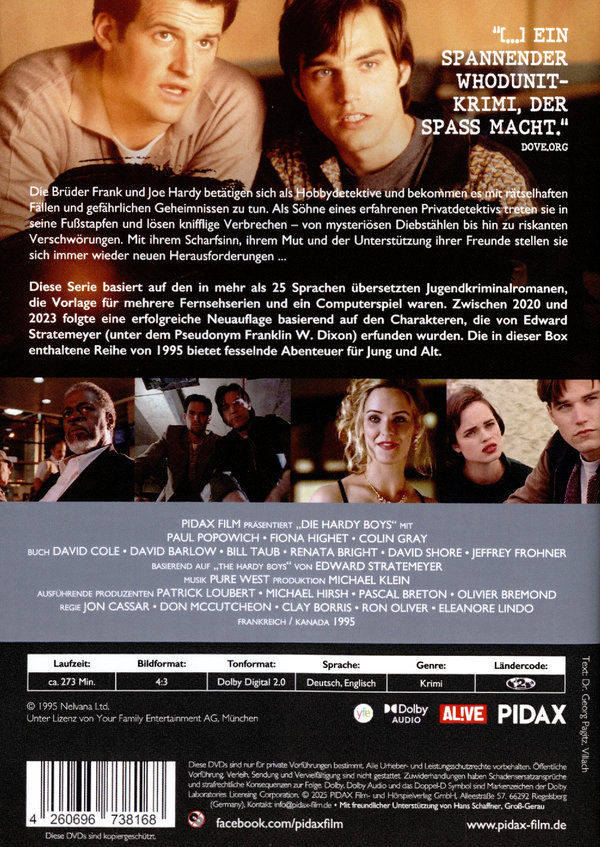 Diese Serie basiert auf den in mehr als 25 Sprachen übersetzten Jugendkriminalromanen, die Vorlage für mehrere Fernsehserien und ein Computerspiel waren. Zwischen 2020 und 2023 folgte eine erfolgreiche Neuauflage basierend auf den Charakteren, die von Edward Stratemeyer (unter dem Pseudonym Franklin W. Dixon) erfunden wurden. Die in dieser Box enthaltene Reihe von 1995 bietet fesselnde Abenteuer für Jung und Alt.