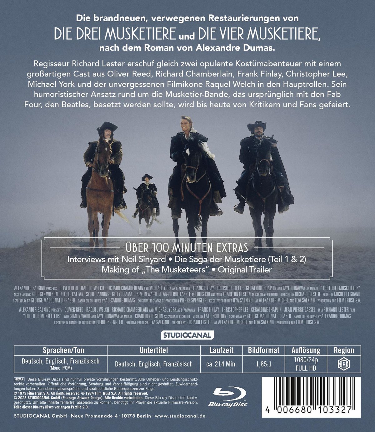 Mit viel Geschick, Fantasie und Humor hat Richard Lester 1973 den weltbekannten Romanklassiker von Alexandre Dumas in ein filmisches Abenteuer für Jung und Alt übersetzt. Rund um das Musketier-Trio aus Oliver Reed, Richard Chamberlain und Frank Finlay trumpft ein kaum zu überbietender Hollywood-Cast auf. Bei der Golden-Globe-Verleihung 1975, wo DIE DREI MUSKETIERE als Bester Film - Komödie oder Musical nominiert war, gewann Raquel Welch für ihre Verkörperung der Constance de Bonacieux den Preis als Beste Hauptdarstellerin - Komödie oder Musical.