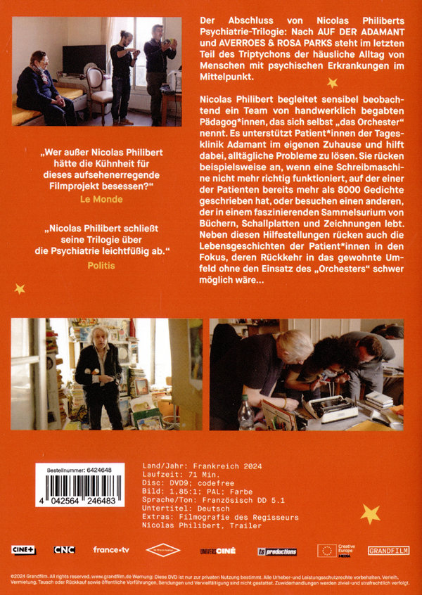 Der Abschluss von Nicolas Philiberts Psychiatrie-Trilogie: Nach AUF DER ADAMANT und AVERROES & ROSA PARKS steht im letzten Teil des Triptychons der häusliche Alltag von Menschen mit psychischen Erkrankungen im Mittelpunkt. Nicolas Philibert begleitet sensibel beobachtend ein Team von handwerklich begabten Pädagog*innen, das sich selbst „das Orchester“ nennt. Es unterstützt Patient*innen der Tagesklinik Adamant im eigenen Zuhause und hilft dabei, alltägliche Probleme zu lösen. Sie rücken beispielsweise an, wenn eine Schreibmaschine nicht mehr richtig funktioniert, auf der einer der Patienten bereits mehr als 8000 Gedichte geschrieben hat, oder besuchen einen anderen, der in einem faszinierenden Sammelsurium von Büchern, Schallplatten und Zeichnungen lebt. Neben diesen Hilfestellungen rücken auch die Lebensgeschichten der Patient*innen in den Fokus, deren Rückkehr in das gewohnte Umfeld ohne den Einsatz des „Orchesters“ schwer möglich wäre…