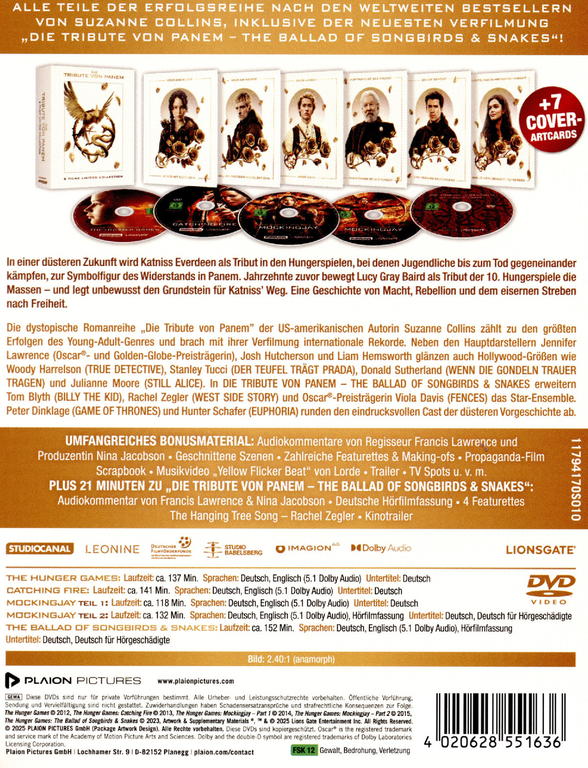 Die dystopische Romanreihe „Die Tribute von Panem" der US-amerikanischen Autorin Suzanne Collins zählt zu den größten Erfolgen des Young-Adult-Genres und brach mit ihrer Verfilmung internationale Rekorde. Neben den Hauptdarstellern Jennifer Lawrence (Oscar®- und Golden-Globe-Preisträgerin), Josh Hutcherson und Liam Hemsworth glänzen auch Hollywood-Größen wie Woody Harrelson (TRUE DETECTIVE), Stanley Tucci (DER TEUFEL TRÄGT PRADA), Donald Sutherland (WENN DIE GONDELN TRAUER TRAGEN) und Julianne Moore (STILL ALICE). In THE BALLAD OF SONGBIRDS AND SNAKES erweitern Tom Blyth (BILLY THE KID), Rachel Zegler (WEST SIDE STORY) und Oscar®-Preisträgerin Viola Davis (FENCES) das Star-Ensemble. Peter Dinklage (GAME OF THRONES) und Hunter Schafer (EUPHORIA) runden den eindrucksvollen Cast der düsteren Vorgeschichte ab.