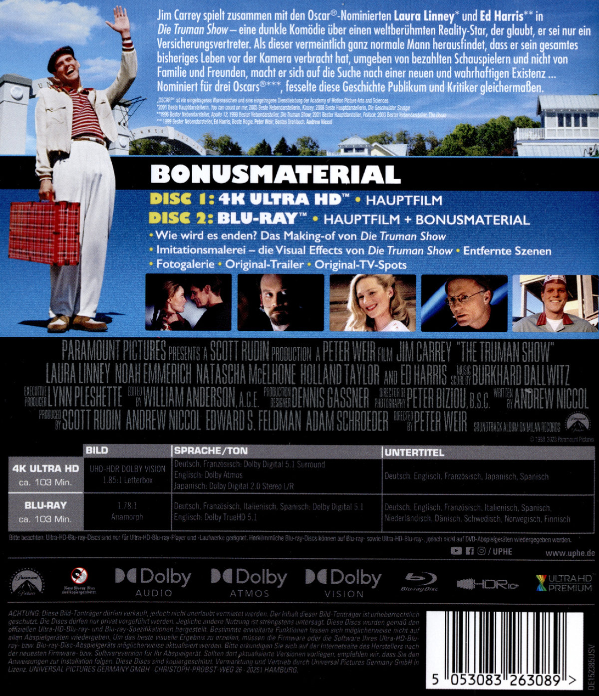 Er ist der Star der Show, aber er weiß es nicht. Jim Carrey begeistert als ahnungsloser Truman Burbank sowohl Kritiker als auch Publikum - in diesem großartigen Film von Regisseur Peter Wier ("Witness", "Der Club der toten Dichter") über einen Mann, dessen Leben eine ununterbrochene TV-Show ist. Truman realisiert nicht, dass seine idyllische Heimatstadt ein gigantisches Studio darstellt, das von einem visionären Produzenten/Regisseur/Kreativen (Ed Harris) entwickelt wurde, dass die Leute, die dort leben und arbeiten, Hollywood-Schauspieler sind und dass auch seine unaufhörlich plappernde Ehefrau eine vertraglich gebundene Mitspielerin ist. Nach und nach kommt Truman dahinter. Und was er nach seiner Entdeckung macht, wird Sie zum Lachen, Weinen und zum Jubeln bringen wie kaum ein anderer Film zuvor.