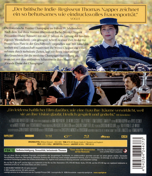 Die französische Provinz Champagne im frühen 19. Jahrhundert: Nach dem Tod ihres Mannes übernimmt Barbe-Nicole Clicquot Ponsardin (Haley Bennett) mit nur 27 Jahren die Leitung der familieneigenen Weinkellerei - ein gewagter Schritt zu einer Zeit, in der für Frauen kein Platz in der Geschäftswelt vorgesehen war. Mit Entschlossenheit und Leidenschaft manövriert die Witwe Clicquot das Unternehmen durch turbulente Zeiten, legt mit ihren Innovationen den Grundstein für die moderne Champagnerherstellung und avanciert mit dem exklusiven Schaumwein ihres Hauses zur "Grande Dame der Champagne".