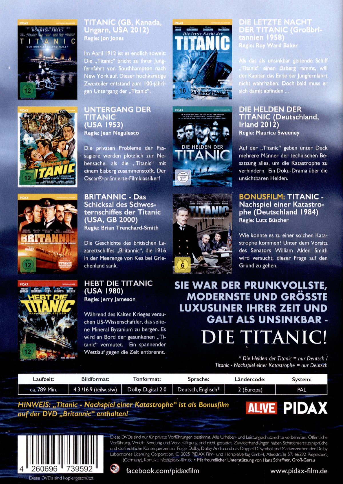 TITANIC (GB, Kanada, Ungarn, USA 2012) – Im April 1912 ist es endlich soweit: Die „Titanic“ bricht zu ihrer Jungfernfahrt von Southhampton nach New York auf. Dieser hochkarätige Zweiteiler entstand zum 100-jährigen Untergang der „Titanic“. DIE LETZTE NACHT DER TITANIC (Großbritannien 1958) – Als das als unsinkbar geltende Schiff „Titanic“ einen Eisberg rammt, will der Kapitän das Ende der Jungfernfahrt nicht wahrhaben. Doch bald muss er sich damit abfinden ... UNTERGANG DER TITANIC (USA 1953) – Die privaten Probleme der Passagiere werden plötzlich zur Nebensache, als die „Titanic“ mit einem Eisberg zusammenstößt. Der Oscar®-prämierte-Filmklassiker! DIE HELDEN DER TITANIC (Deutschland, Irland 2012) – Auf der „Titanic“ geben unter Deck mehrere Männer der technischen Besatzung alles, um die Katastrophe zu verhindern. Ein Doku-Drama über die unsichtbaren Helden. BRITANNIC - DAS SCHICKSAL DES SCHWESTERNSCHIFFES DER TITANIC(USA, GB 2000) – Die Geschichte des britischen Lazarettschiffes „Britannic“, die 1916 in der Meerenge von Kea bei Griechenland sank. TITANIC - NACHSPIEL EINER KATASTROPHE(Deutschland 1984) – Wie konnte es zu einer solchen Katastrophe kommen? Unter dem Vorsitz des Senators William Alden Smith wird versucht, dieser Frage auf den Grund zu gehen. HEBT DIE TITANIC (USA 1980) – Während des Kalten Krieges versuchen US-Wissenschaftler, das seltene Mineral Byzanium zu bergen. Es wird an Bord der gesunkenen „Titanic“ vermutet. Ein spannender Wettlauf gegen die Zeit entbrennt.