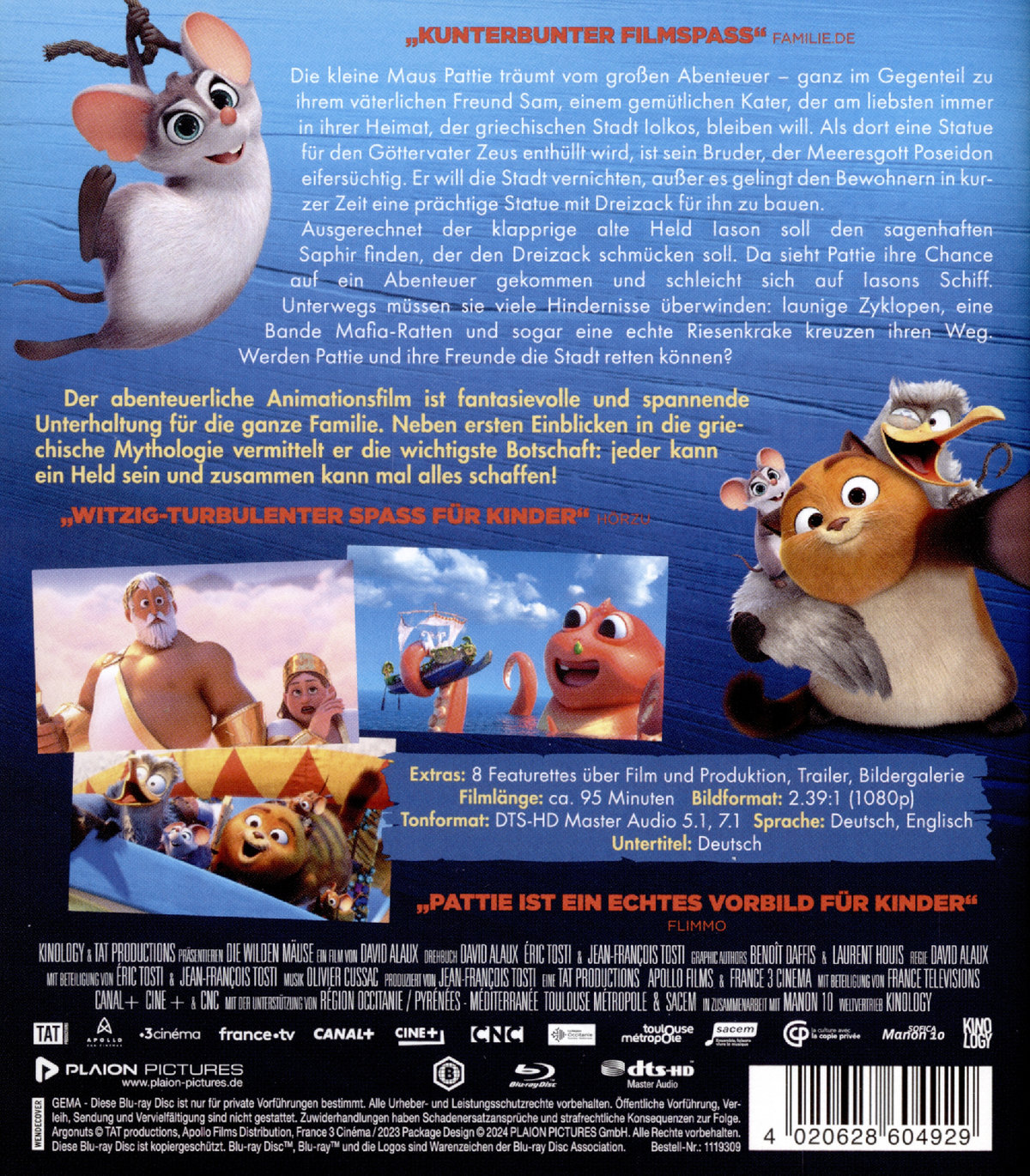 Die kleine Maus Pattie träumt vom großen Abenteuer – ganz im Gegenteil zu ihrem väterlichen Freund Sam, einem gemütlichen Kater, der am liebsten immer in ihrer Heimat, der griechischen Stadt Iolkos, bleiben will. Als dort eine Statue für den Göttervater Zeus enthüllt wird, ist sein Bruder, der Meeresgott Poseidon eifersüchtig. Er will die Stadt vernichten, außer es gelingt den Bewohnern in kurzer Zeit eine prächtige Statue mit Dreizack für ihn zu bauen. Ausgerechnet der klapprige alte Held Iason soll den sagenhaften Saphir finden, der den Dreizack schmücken soll. Da sieht Pattie ihre Chance auf ein Abenteuer gekommen und schleicht sich auf Iasons Schiff. Unterwegs müssen sie viele Hindernisse überwinden: launige Zyklopen, eine Bande Mafia-Ratten und sogar eine echte Riesenkrake kreuzen ihren Weg. Werden Pattie und ihre Freunde die Stadt retten können? Der abenteuerliche Animationsfilm ist fantasievolle und spannende Unterhaltung für die ganze Familie. Neben ersten Einblicken in die griechische Mythologie vermittelt er die wichtigste Botschaft: jeder kann ein Held sein und zusammen kann mal alles schaffen!