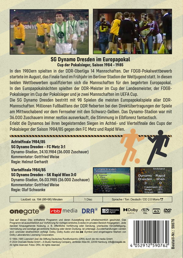 Das Dynamo Stadion war mit 36.000 Zuschauern immer restlos ausverkauft, die Stimmung in Elbflorenz fantastisch. Erlebt die Dynamos bei Ihren begeisternden Siegen im Achtel-und Viertelfinale des Cups der Pokalsieger der Saison 1984/85 gegen den FC Metz und Rapid Wien.