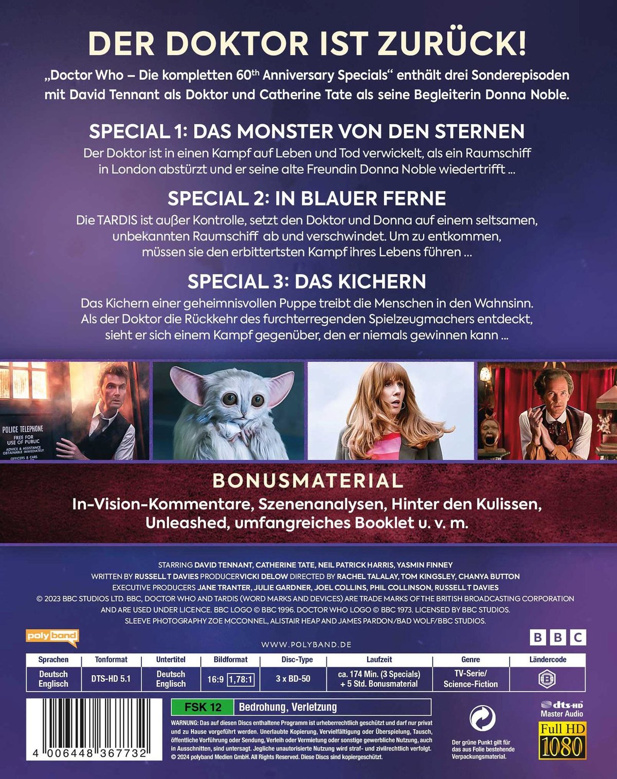 "Doctor Who – Die kompletten 60th Anniversary Specials" enthält drei Sonderepisoden mit David Tennant als Doktor und Catherine Tate als seine Begleiterin Donna Noble.