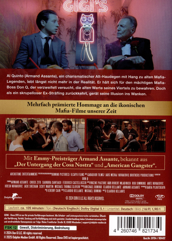 Al Quinto verliert den Verstand. Der rasante Wandel in seinem geliebten Little Italy ist mehr, als er verkraften kann. Angetrieben von seiner obsessiven Beschäftigung mit der Mafia – er verbringt schlaflose Nächte damit, Gangsterfilme zu schauen und Bücher über das organisierte Verbrechen zu lesen – durchlebt Quinto eine Verwandlung. Eines Tages verlässt er sein tristes Apartment als der heldenhafte und ehrenhafte Don Q, ein angesehener Mafia-Boss und selbsternannter Beschützer von Little Italy, der um jeden Preis die alten Zeiten zurückbringen will. Don Q ist eine einzigartige, moderne Neuinterpretation des Don Quixote-Mythos, angesiedelt in den Straßen von Little Italy. Armand Assante brilliert in der Hauptrolle als ein in die Jahre gekommener Mann, der sich für einen mächtigen Mafia-Boss hält. Don Q ist eine fesselnde Mischung aus Drama, Komödie und Gesellschaftssatire, die das Publikum mit Humor, Herz und nachdenklichen Momenten begeistert. Die eindrucksvolle Kameraführung fängt das lebendige Flair von Little Italy ein, während ein hochkarätiges Ensemble aus charismatischen Charakteren für eine unterhaltsame und emotionale Filmerfahrung sorgt. Ein Muss für Filmfans, die charmante Gangsterkomödien mit Tiefgang lieben.