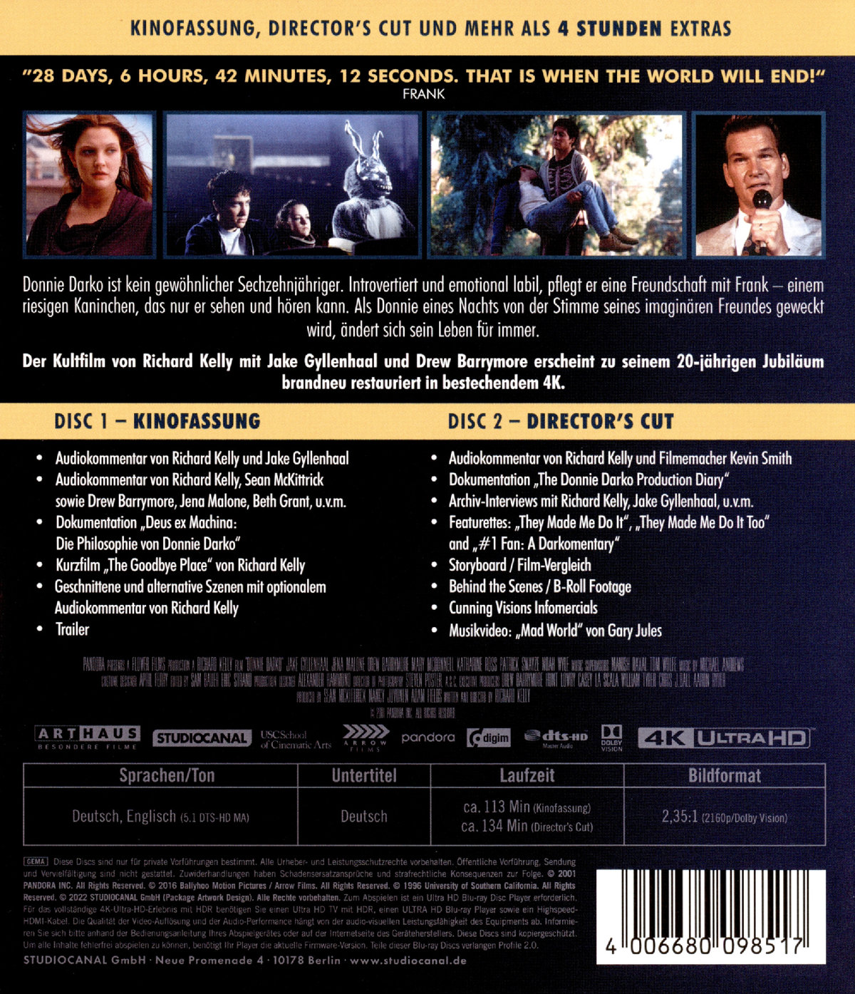 Zum Kinostart 2001 zunächst mit verschiedensten Problemen behaftet entwickelte sich DONNIE DARKO erst über die Jahre zum wohl ersten Kultklassiker des neuen Jahrtausends. Ausgestattet mit einem großartigen Cast, angefangen bei den Geschwistern Jake und Maggie Gyllenhaal vor ihrem Hollywood-Durchbruch über Frauenschwarm Patrick Swayze, die Oscar®-nominierte Katherine Ross, 80-er Jahre Kinderstar Drew Barrymore und Fernsehliebling Noah Wyle und einem stimmungsvollen Soundtrack von 80er-Jahre-Klassikern von Echo and the Bunnymen, Tears for Fears und Duran Duran wurde DONNIE DARKO zur Inspiration vieler Independent-Filmemachern und erscheint nun in einer neuen Restaurierung, die nicht nur Fans von Donnie und Frank begeistern wird.