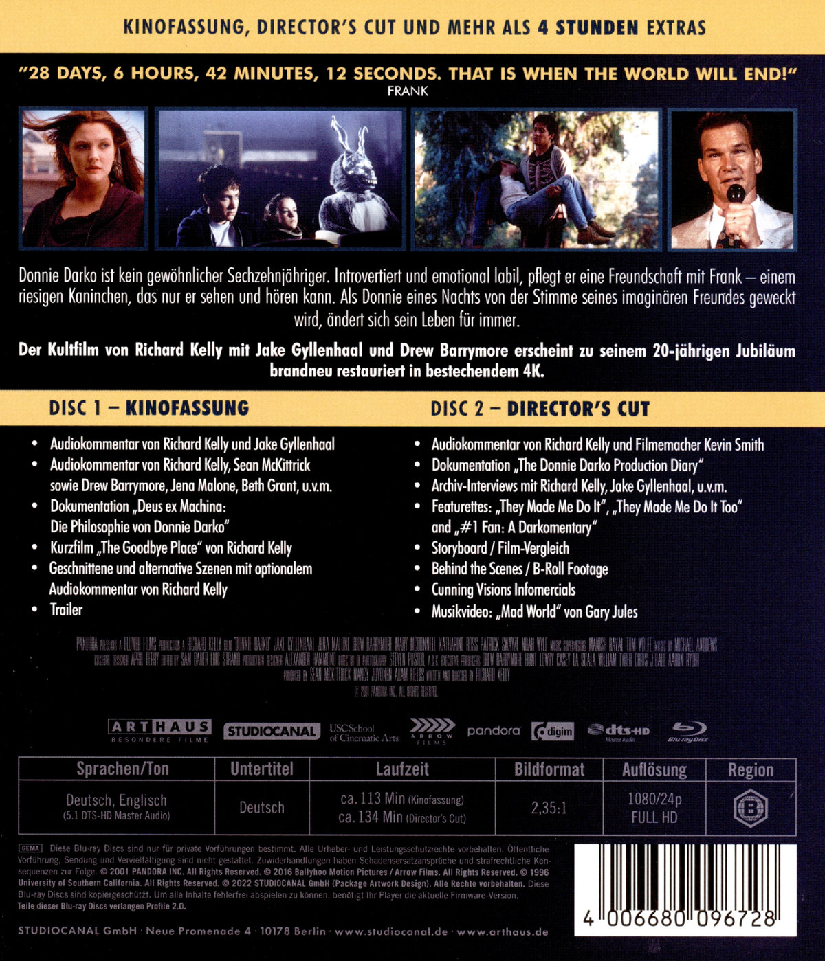 Middlesex, Iowa, 1988: Donnie Darko (Jake Gyllenhaal) ist auf den ersten Blick ein typisch amerikanischer Teenager, ausgestattet mit einem scharfen Intellekt, lebhafter Fantasie und einer weltmüden Weisheit, doch ebenso introvertiert und emotional labil pflegt er eine Freundschaft mit Frank, einem riesigen Kaninchen, dass nur er sehen kann. Als Donnie eines Nachts von seinem imaginären Freund geweckt wird, der ihm offenbart, dass die Welt untergehen wird, entgeht er um ein Haar einem Unfall, der tödlich hätte enden können. Von da an wird Frank zu Donnies ständigem Begleiter und provoziert eine Reihe von Ereignissen, die in der Kleinstadt für jede Menge Ärger sorgen. Doch was steckt wirklich hinter der Stimme in Donnies Kopf? Kinofassung und Director's Cut. Mit seinem Spielfilmdebüt schuf der erst 26-jährige Richard Kelly einen Kultfilm für eine ganze Generation. Kelly, der sein Drehbuch als eine Art „Fänger im Roggen erzählt von Philip K. Dick“ bezeichnete, nimmt den Zuschauer in einem ungewöhnlichen Genre-Mix aus melancholischer Science-Fiction, Coming-of-Age, Teenager-Komödie und phantastischem Thriller mit auf eine (alb-)traumhaft erscheinende Reise in den Schwebezustand zwischen der Welt der Kindheit und der Erwachsenen. Zum Kinostart 2001 zunächst mit verschiedensten Problemen behaftet entwickelte sich DONNIE DARKO erst über die Jahre zum wohl ersten Kultklassiker des neuen Jahrtausends. Ausgestattet mit einem großartigen Cast, angefangen bei den Geschwistern Jake und Maggie Gyllenhaal vor ihrem Hollywood-Durchbruch über Frauenschwarm Patrick Swayze, die Oscar®-nominierte Katherine Ross, 80-er Jahre Kinderstar Drew Barrymore und Fernsehliebling Noah Wyle und einem stimmungsvollen Soundtrack von 80er-Jahre-Klassikern von Echo and the Bunnymen, Tears for Fears und Duran Duran wurde DONNIE DARKO zur Inspiration vieler Independent-Filmemachern und erscheint nun in einer neuen Restaurierung, die nicht nur Fans von Donnie und Frank begeistern wird. Presse: - "Ein brillantes und wirklich unglaubliches Kunstwerk!" - (Cinema Crazed)