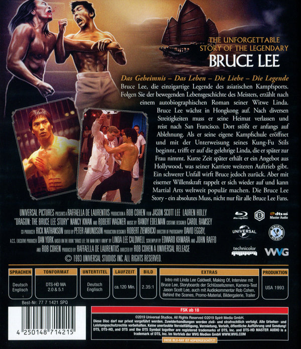 Die Geschichte der größten Legende des asiatischen Kampfsports: Bruce Lee. Star-Regisseur Rob Cohen gelang 20 Jahre nach Lee's mysteriösem Tod im Jahre 1973 ein einmaliger Film über das faszinierende Leben des Mannes, der Kung Fu zur Philosophie erhob. Perfekt in seiner Kampfkunst ebenso wie als Hauptdarsteller vieler Hollywood-Produktionen. Erleben Sie unvergessene Action- und Karateszenen aus den Bruce Lee Filmen. Folgen Sie der bewegenden Lebensgeschichte des Meisters, zum ersten Mal vollständig erzählt nach einem autobiographischem Roman seiner Witwe Linda. Die Bruce Lee Story - ein absolutes Muss nicht nur für alle Bruce Lee Fans.