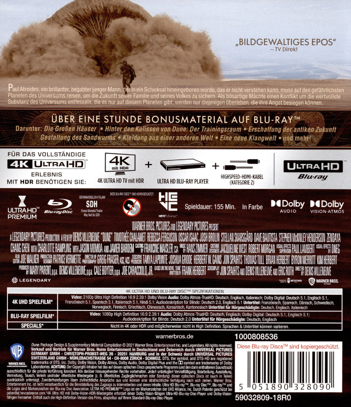 "Dune" erzählt die packende Geschichte des brillanten jungen Helden Paul Atreides, dem das Schicksal eine Rolle vorherbestimmt hat, von der er niemals geträumt hätte. Um die Zukunft seiner Familie und seines gesamten Volkes zu sichern, muss Paul auf den gefährlichsten Planeten des Universums reisen. Nur auf dieser Welt existiert ein wertvoller Rohstoff, der es der Menschheit ermöglichen könnte, ihr vollständiges geistiges Potenzial auszuschöpfen.