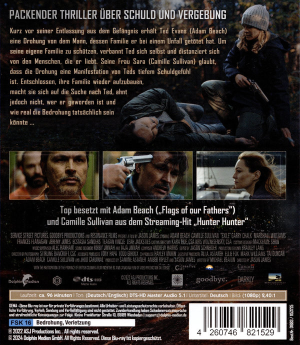 Kurz vor seiner Entlassung aus dem Gefängnis erhält Ted Evans (Adam Beach) eine Drohung von dem Mann, dessen Familie er bei einem Unfall getötet hat. Um seine eigene Familie zu schützen, verbannt sich Ted selbst, führt ein zurückgezogenes Leben und distanziert sich von den Menschen, die er liebt. Seine Frau Sara (Camille Sullivan) glaubt, dass die Drohung eine Manifestation von Teds tiefem Schuldgefühl ist. Entschlossen, ihre Familie wieder aufzubauen, macht sie sich auf die Suche nach Ted, ahnt jedoch nicht, wer er geworden ist und wie real die Bedrohung tatsächlich sein könnte. Exile sticht durch seine intensive und fesselnde Handlung hervor, die komplexe Themen wie Schuld und Verantwortung behandelt. Die Charakterentwicklung, insbesondere von Ted und Sara, lässt die Zuschauer tief in die emotionalen Konflikte der Protagonisten eintauchen. Mit einem ständigen Gefühl der Bedrohung und unerwarteten Wendungen sorgt der Film für packende Spannung bis zur letzten Minute.