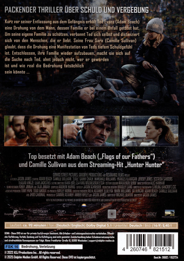 Kurz vor seiner Entlassung aus dem Gefängnis erhält Ted Evans (Adam Beach) eine Drohung von dem Mann, dessen Familie er bei einem Unfall getötet hat. Um seine eigene Familie zu schützen, verbannt sich Ted selbst, führt ein zurückgezogenes Leben und distanziert sich von den Menschen, die er liebt. Seine Frau Sara (Camille Sullivan) glaubt, dass die Drohung eine Manifestation von Teds tiefem Schuldgefühl ist. Entschlossen, ihre Familie wieder aufzubauen, macht sie sich auf die Suche nach Ted, ahnt jedoch nicht, wer er geworden ist und wie real die Bedrohung tatsächlich sein könnte. Exile sticht durch seine intensive und fesselnde Handlung hervor, die komplexe Themen wie Schuld und Verantwortung behandelt. Die Charakterentwicklung, insbesondere von Ted und Sara, lässt die Zuschauer tief in die emotionalen Konflikte der Protagonisten eintauchen. Mit einem ständigen Gefühl der Bedrohung und unerwarteten Wendungen sorgt der Film für packende Spannung bis zur letzten Minute.