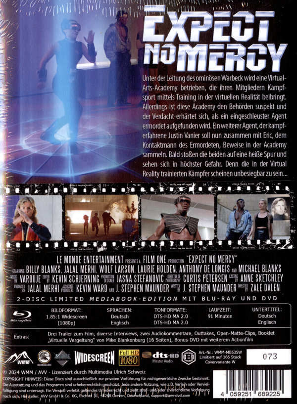 Expect no Mercy BR - 4K HD Remastered - Wattiertes Mediabook Unter der Leitung des ominösen Warbeck (Wolf Larson) wird eine Virtual Arts Academy betrieben, die ihren Mitgliedern Kampfsport mittels Training in der Virtual Reality beibringt. Allerdings ist diese Academy den Behörden suspekt und der Verdacht erhärtet sich, als ein eingeschleuster Agent ermordet aufgefunden wird. Der kampferfahrene Agent Justin Vanier (Billy Blanks) soll sich nun einschleusen lassen, um dort mit Eric (Jalal Merhi), dem Kontaktmann des Ermordeten, Beweise zu sammeln. Bald stoßen die beiden auf eine heiße Spur und sehen sich in höchster Gefahr... Bild: 1.85:1 Widescreen (1080p) | Ton: Deutsch / Englisch DTS-HD MA 2.0 | Untertitel: Deutsch / Englisch | Extras: deutscher Trailer (HD), zwei englische Trailer (HD), Audiokommentar mit Jalal Merhi, Audiokommentar mit Zale Dalen, Interviews mit Billy Blanks, Jala Merhi, Anthony De Longis und Zale Dalen, Outtakes, Clips aus der Open-Matte-Fassung, Booklet von Mike Blankenburg (16 Seiten), Bonus-DVD mit weiterem Actionfilm