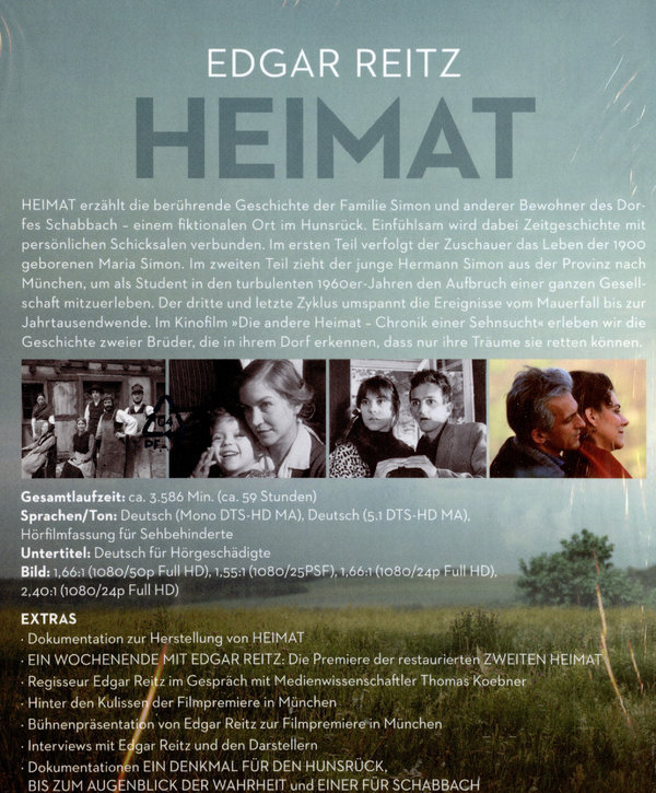 HEIMAT erzählt die berührende Geschichte der Familie Simon und anderer Bewohner des Dorfes Schabbach – einem fiktionalen Ort im Hunsrück. Einfühlsam wird dabei Zeitgeschichte mit persönlichen Schicksalen verbunden. (16 Blu-rays + 3 DVDs)