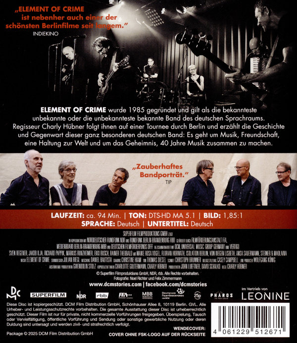 Dieser Film erzählt die Geschichte und Gegenwart einer ganz besonderen deutschen Band, die Geschichte von ELEMENT OF CRIME: Es geht um Musik, Freundschaft, eine Haltung zur Welt und um das Geheimnis, 40 Jahre Musik zusammen zu machen. ELEMENT OF CRIME wurde 1985 gegründet und ist seitdem aus der deutschen Musiklandschaft nicht mehr wegzudenken. Sie gilt als die bekannteste unbekannte oder die unbekannteste bekannte Band des deutschen Sprachraums. Was sind das für Künstler? Wie wurden sie zu dem, was sie sind? Regisseur Charly Hübner geht diesen Fragen mit viel Feingefühl nach. Er folgt der Band auf einer Tournee durch Berlin, die eigens für diesen Film organisiert wurde, und führt uns zu Orten, die stellvertretend für die Entwicklung der Band stehen. Wir sehen die Mauerstadt Berlin, erfahren von den wichtigsten Weggefährten, von New York, John Cale, London, Düsseldorf, Ata Tak, dem Ende der Neuen Deutschen Welle und dem Anfang von ELEMENT OF CRIME. Nie nostalgisch, nie klingt er nach der "guten alten Zeit". Dafür ist die Band viel zu lebendig - im Grunde auf dem Höhepunkt ihres Schaffens.
